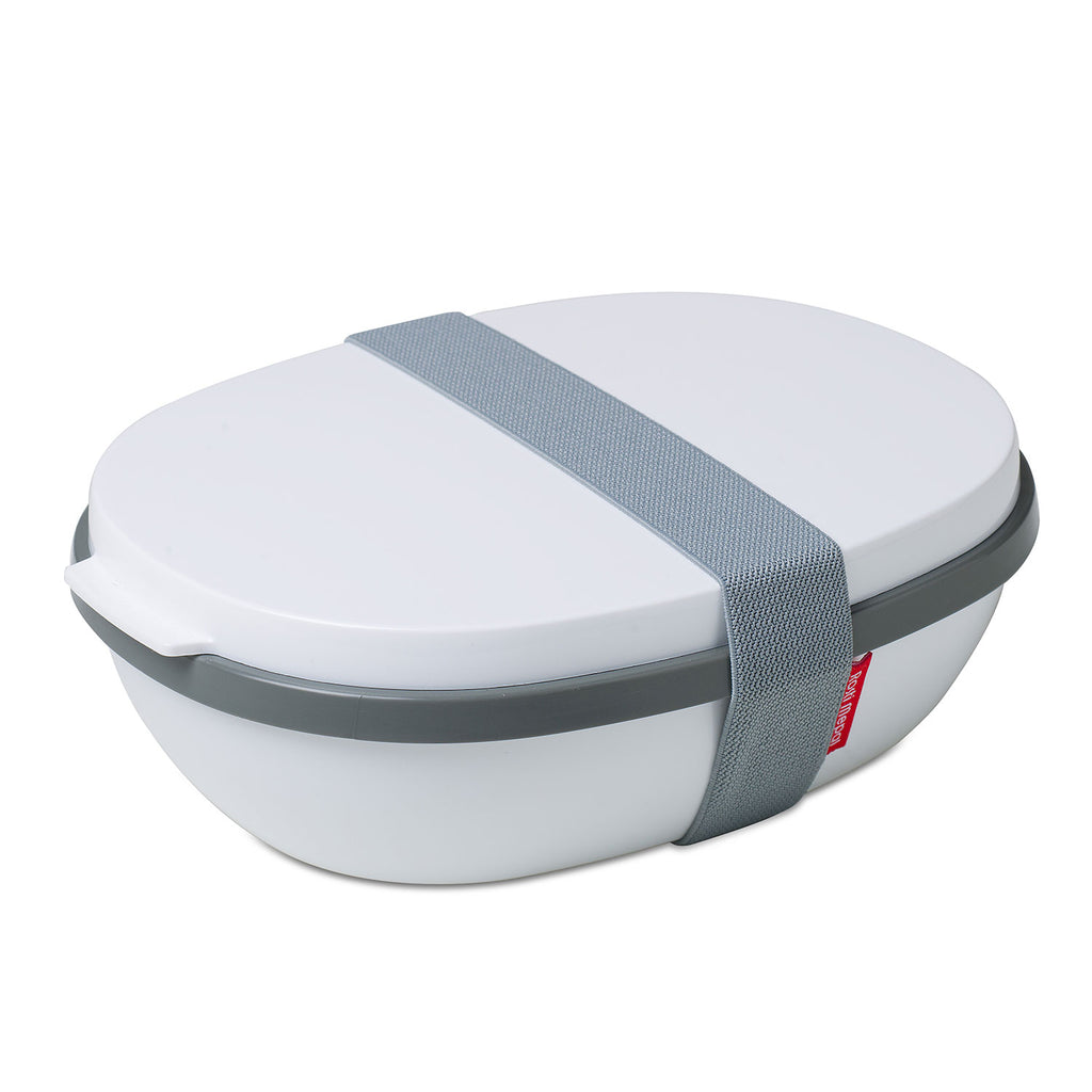 Lunchbox Ellipse duo in de kleur wit. Deze stijlvolle en stevige witte lunchbox past perfect in een gezonde levensstijl. Groot genoeg voor boterhammen en lekkere salades, maar ook voor het opwarmen van een complete maaltijd met rijst of pasta. De Ellipse duo mag namelijk - zonder het compartiment - in de magnetron! In het royale compartiment kunt u brood, tomaatjes of mueslirepen vervoeren en er is genoeg plek voor bestek. Dressings, croutons of pijnboompitjes kunt u meenemen in de aparte mini box en na gebruik mag de Ellipse lunchbox gewoon in de vaatwasser. Een fraaie decoratieve band maakt de Ellipse duo helemaal compleet!