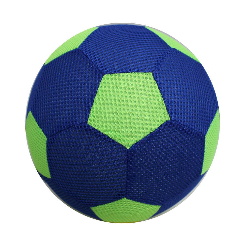 Bal met mesh panelen in de kleuren blauw en geel. Voelt door het mesh zacht aan, kinderen kunnen de bal dus veilig gebruiken. De bal wordt onopgeblazen geleverd.