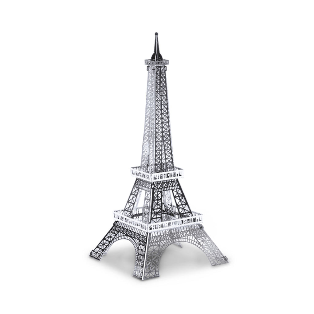 Dit model van de Eiffel Toren bestaat uit één metalen vel met onderdeeltjes en een gedetailleerde bouwtekening.