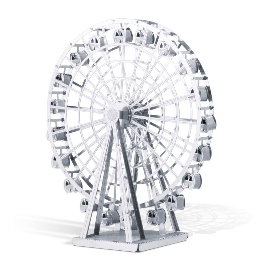 Dit model van een reuzenrad bestaat uit twee metalen vellen met onderdeeltjes en een gedetailleerde bouwtekening.