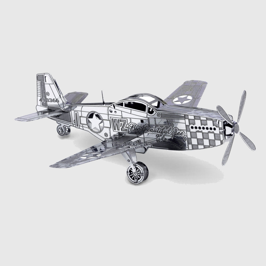 Dit model van het Mustang P-51 jachtvliegtuig bestaat uit één metalen vel met onderdeeltjes en een gedetailleerde bouwtekening.