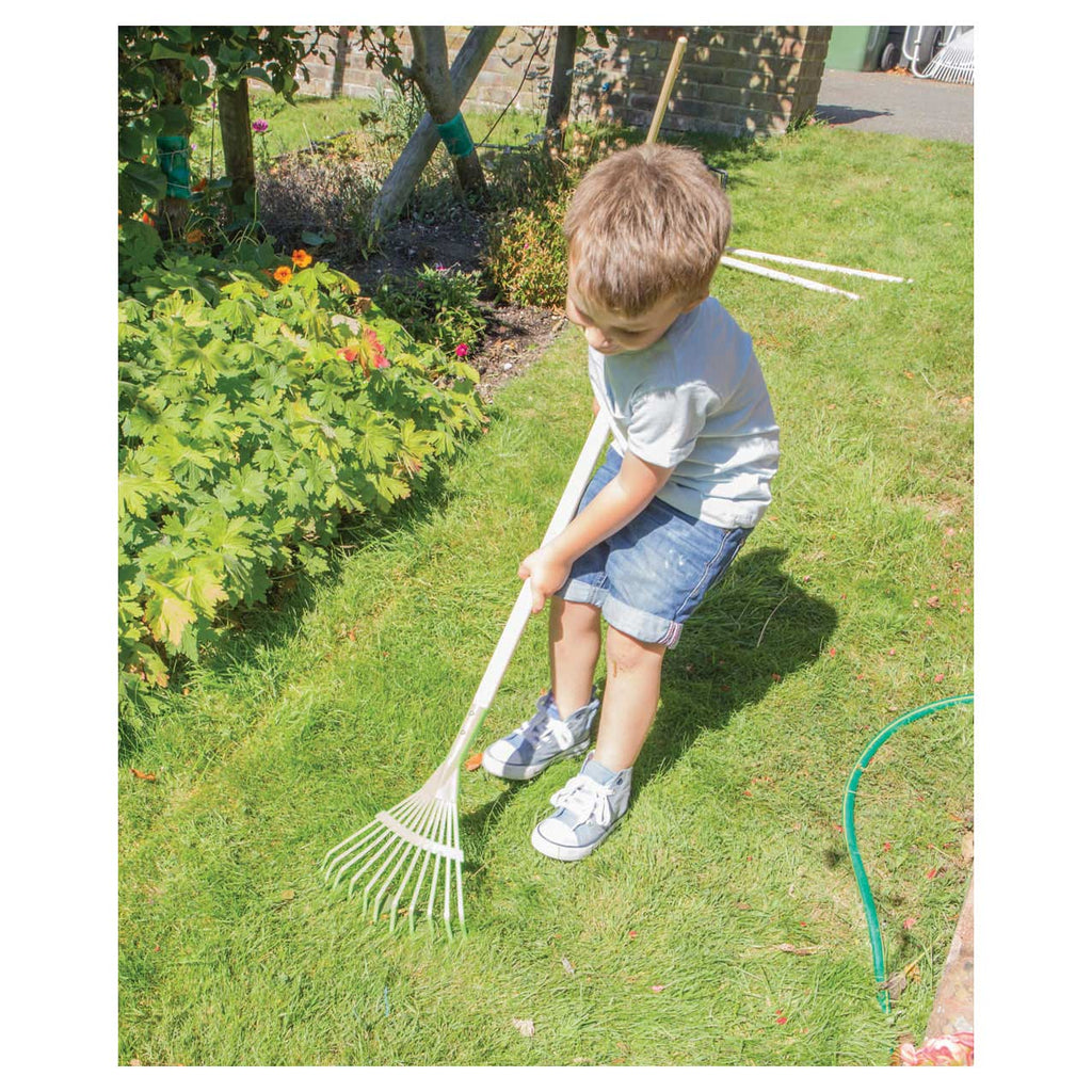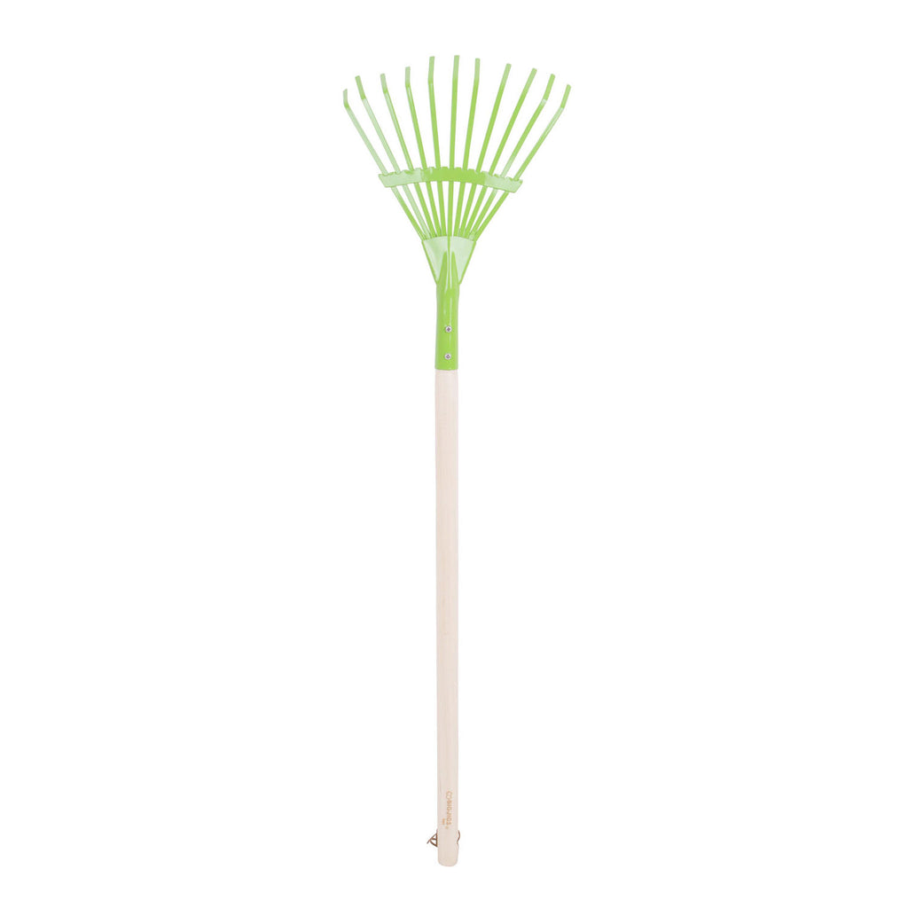 Help jij papa en mama in de tuin? Deze metalen bladhark met houten steel heeft een lengte van 86 cm en is speciaal gemaakt voor de kleine kinderhandjes.