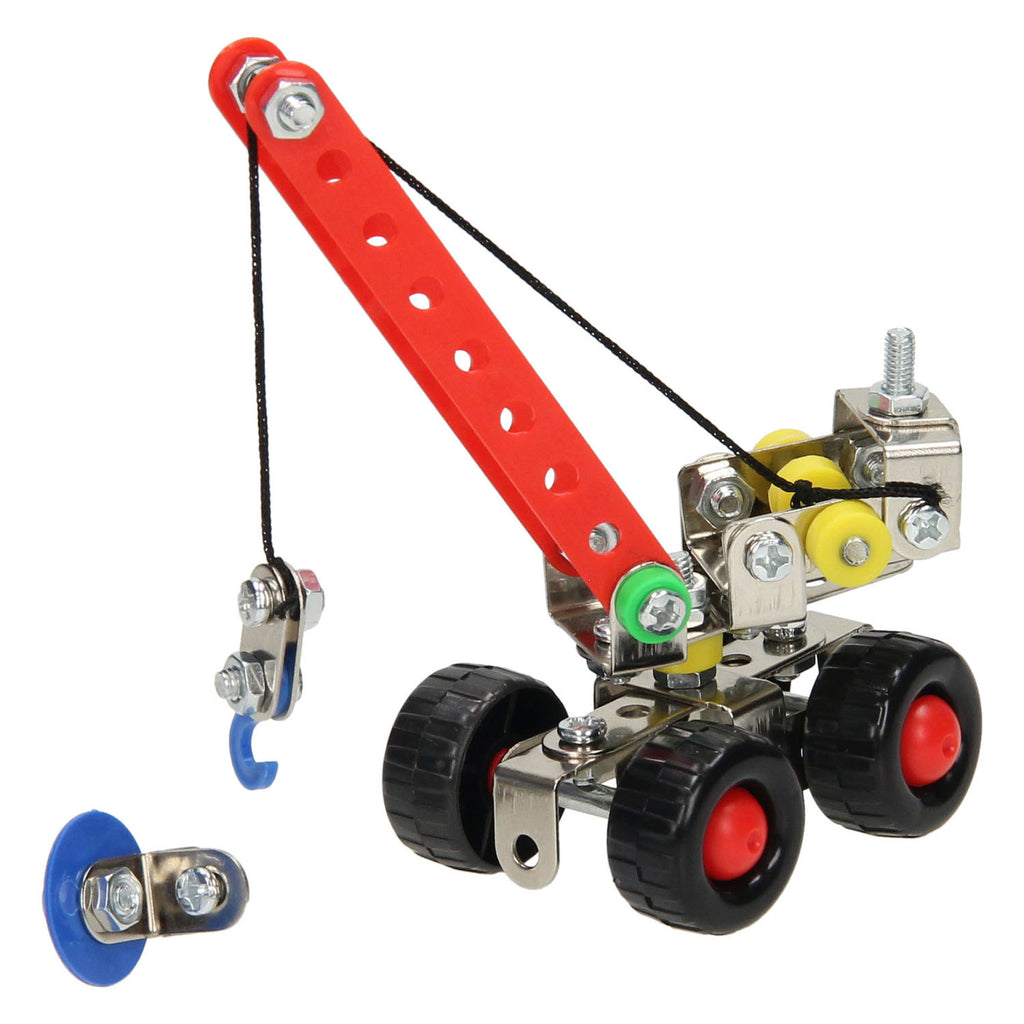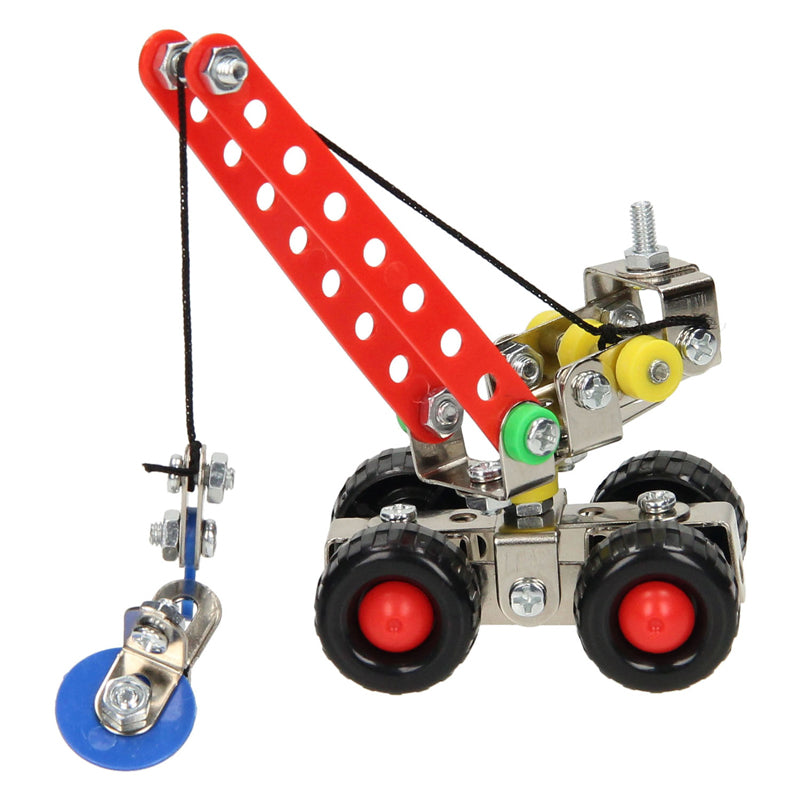 Bouwpakket om een metalen kraan mee te bouwen. De kraan is 12,5 x 5 x 9,5 cm groot en geschikt voor kinderen vanaf 6 jaar.