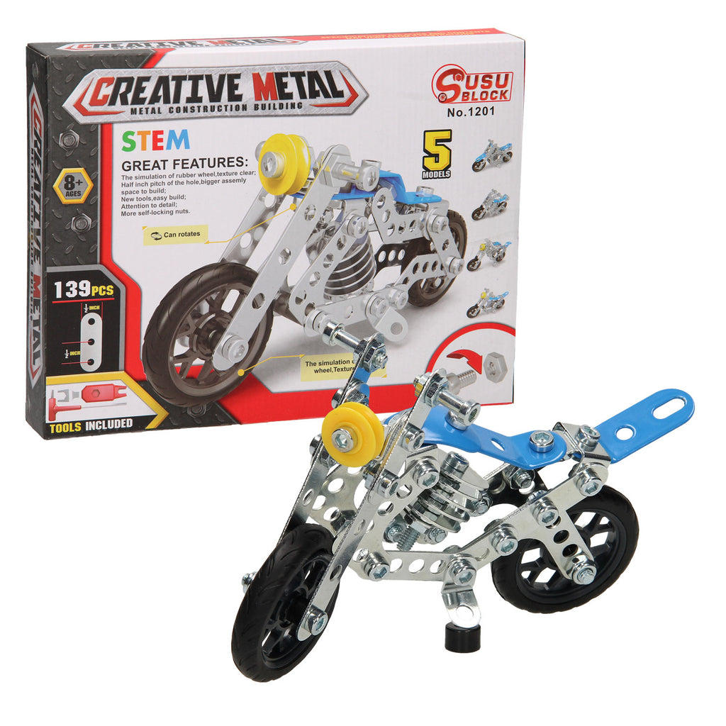 Met de metalen constructieset maak je een stoere en robuuste motor! Kies uit één van de vijf ontwerpen en zet de motor met bijgeleverde gereedschapstools in elkaar. De set bestaat uit 139 onderdelen en komt inclusief gereedschap.