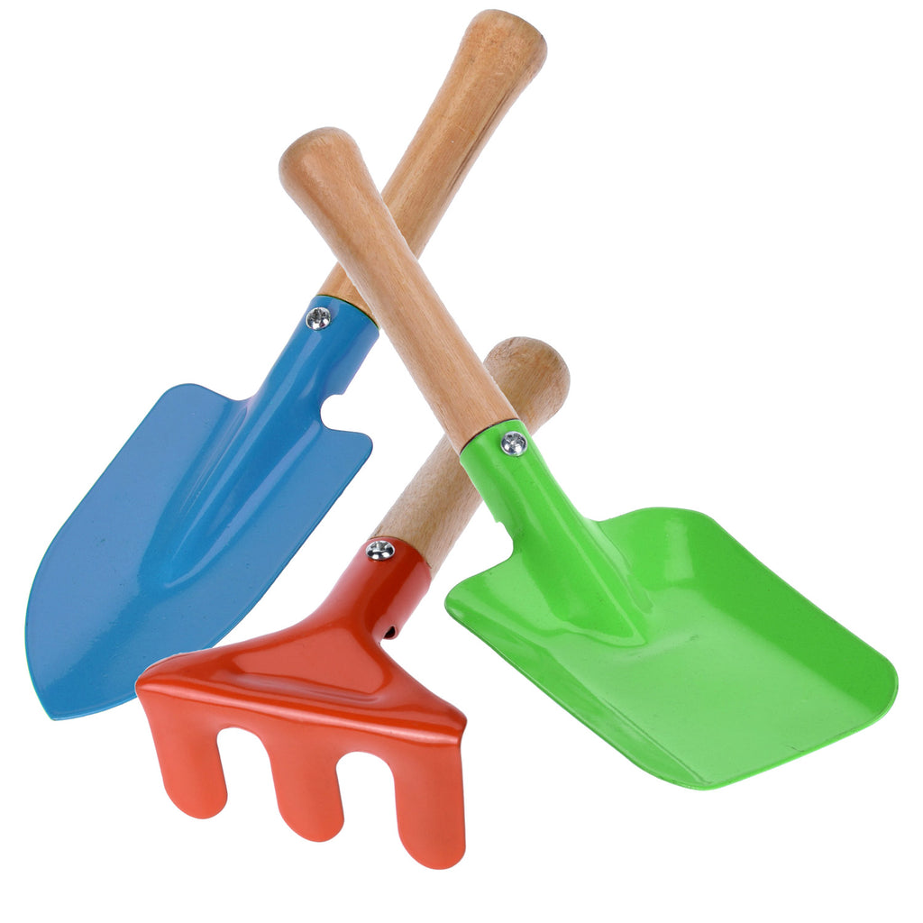 Dit kindertuingereedschap is speciaal voor gemaakt voor de kleine groene vingertjes. Ga zelf aan de slag in de tuin met de schepjes en de hark. Het handvat is van hout en de schepjes en de hard zijn van metaal. Geschikt vanaf 3 jaar.