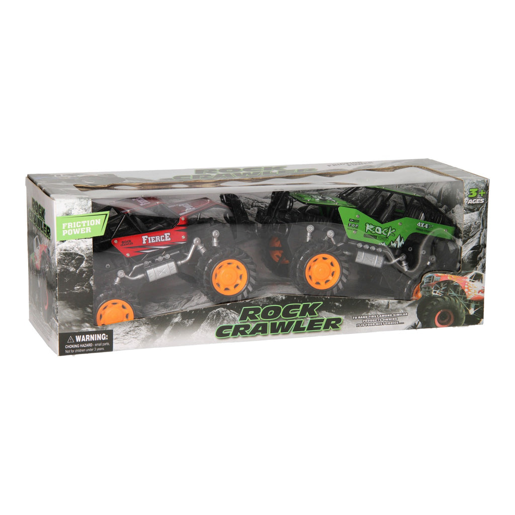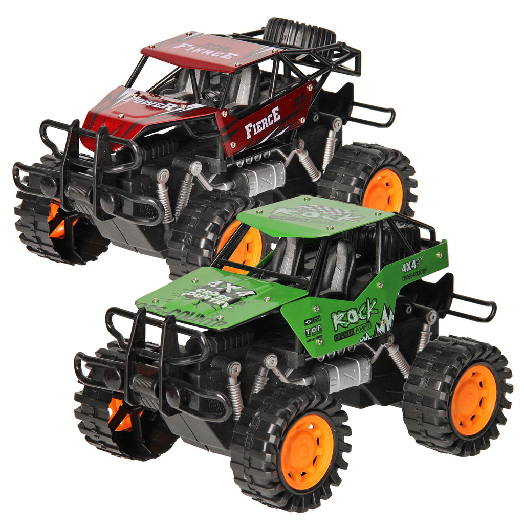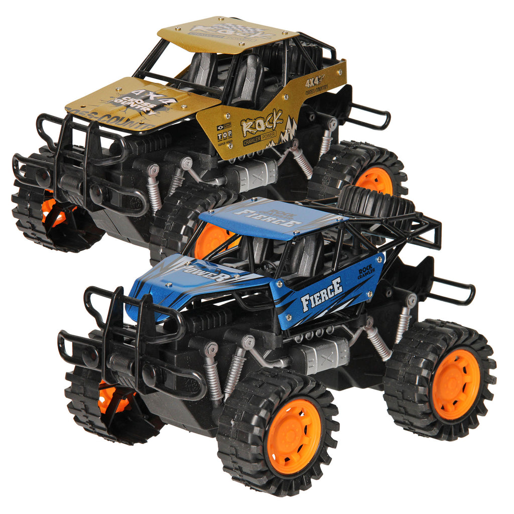 Deze robuuste metalen terreinwagens met frictiemotor zijn speciaal gemaakt voor stoere koeriers. Door de grote banden, veringen en flinke bumper is deze auto klaar voor woeste terreinen! De terreinwagens zijn verkrijgbaar in groen en rood of blauw en goud.