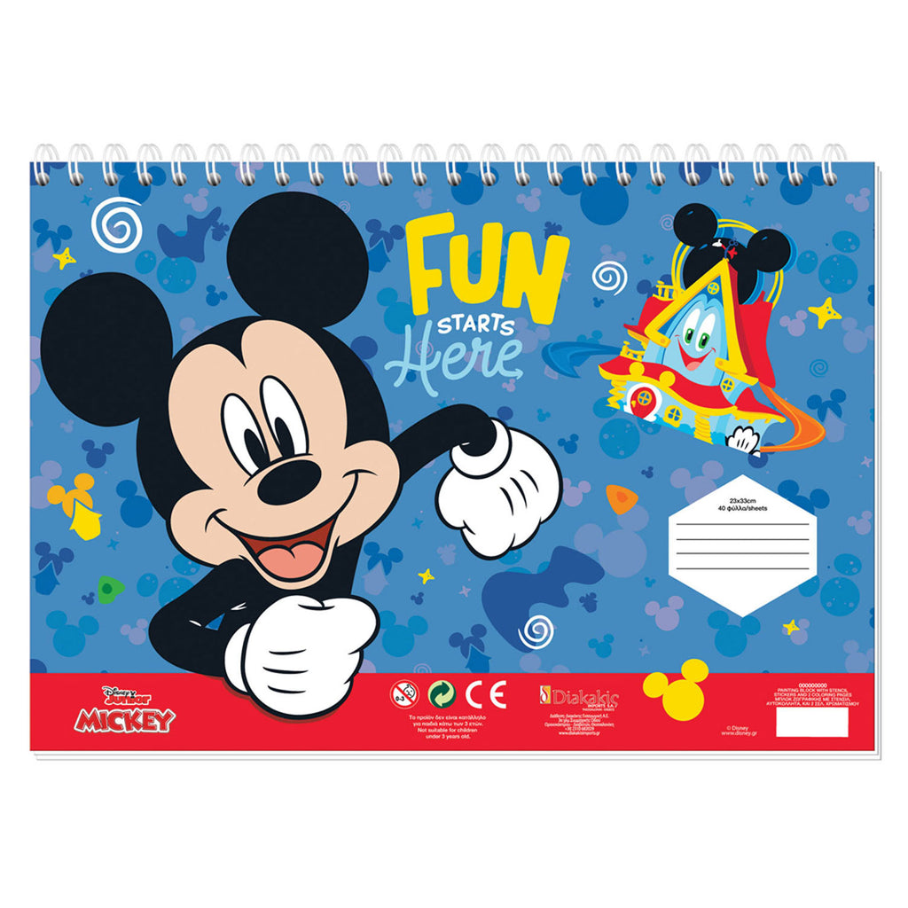 Schilder of kleur deze tekeningen van Mickey Mouse. Plak de verschillende stickers op de tekeningen. Aan de buitenkant van het schetsblok zit een liniaal van 30 centimeter lang, en uitsparingen in verschillende vormen, zoals een hartje, boom en vierkant, die je na kunt trekken met een stift of potlood. Het schetsboek is 33 bij 23 centimeter. Inclusief stickers en liniaal. Geschikt voor kinderen van 3 tot 6 jaar oud.