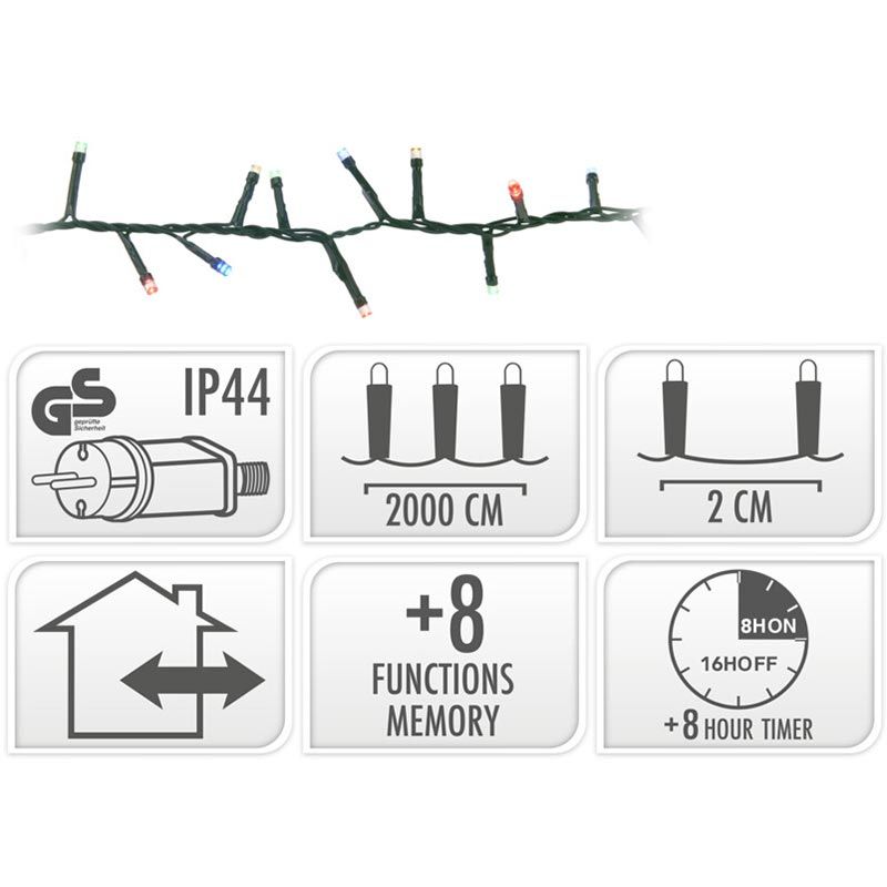 - 8 lichtfuncties: 1.Combination, 2. In waves, 3.Sequential, 4. Slo glo, 5. Chasing/flash, 6.Slow fade, 7.Twinkle/flash, 8.Steady on