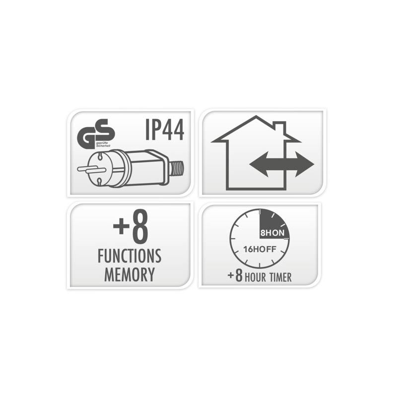 - 8 lichtfuncties: 1.Combination, 2. In waves, 3.Sequential, 4. Slo glo, 5. Chasing/flash, 6.Slow fade, 7.Twinkle/flash, 8.Steady on