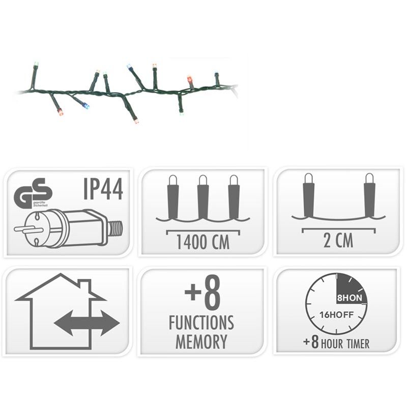- 8 lichtfuncties: 1.Combination, 2. In waves, 3.Sequential, 4. Slo glo, 5. Chasing/flash, 6.Slow fade, 7.Twinkle/flash, 8.Steady on