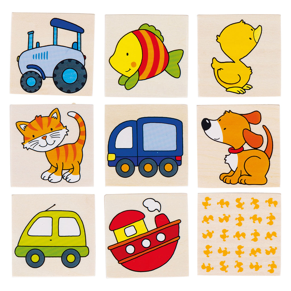 Houten memoriespel met verschillende kleurrijke en herkenbare afbeeldingen.