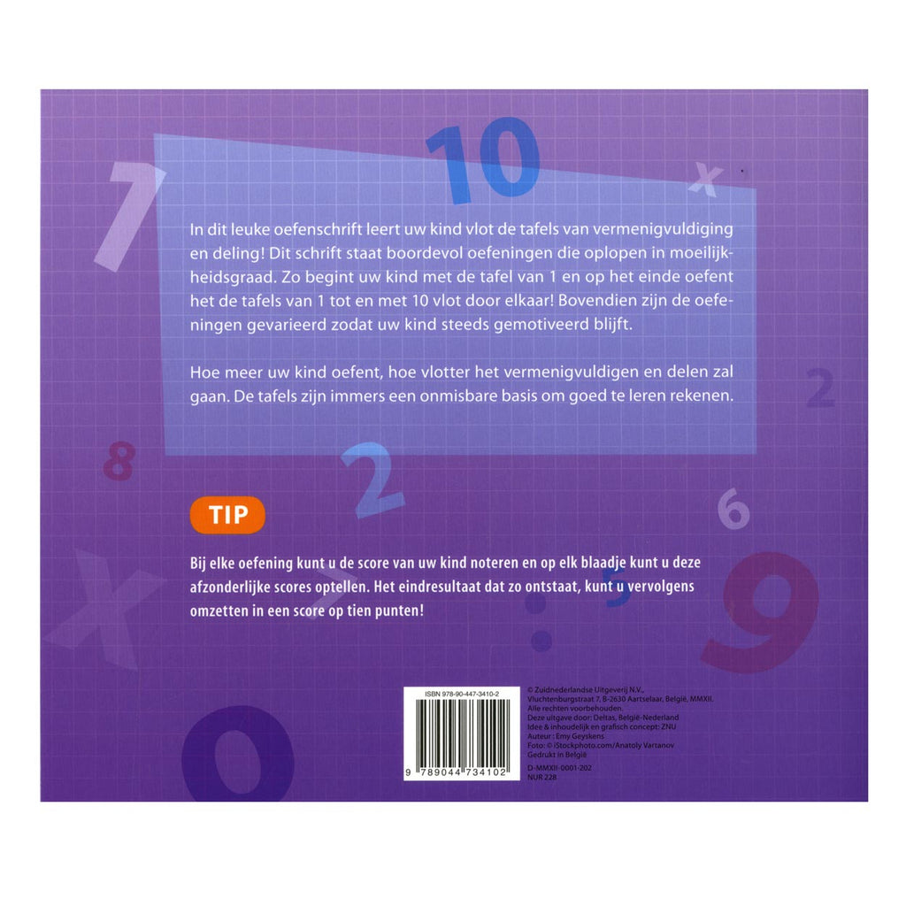 In dit leuke oefenschrift leert uw kind vlot de tafels van vermenigvuldiging en deling! Dit schrift staat boordevol oefeningen die oplopengebouwd in moeilijkheidsgraad. Zo begint uw kind met de tafels van 1 en op het einde oefent het de tafels van 1 tot en met 10 vlot door elkaar! Bovendien zijn de oefeningen gevarieerd zodat uw kind steeds gemotiveerd blijft. Hoe meer uw kind oefent, hoe vlotter het vermenigvuldigen en delen zal gaan. De tafels zijn immers een onmisbare basis om goed te leren rekenen. Tip: Bij elke oefening kunt u de score van uw kind noteren en op elk blaadje kunt u deze afzonderlijke scores optellen. Het eindresultaat dat zo ontstaat, kunt u vervolgens omzetten in een score op tien punten!