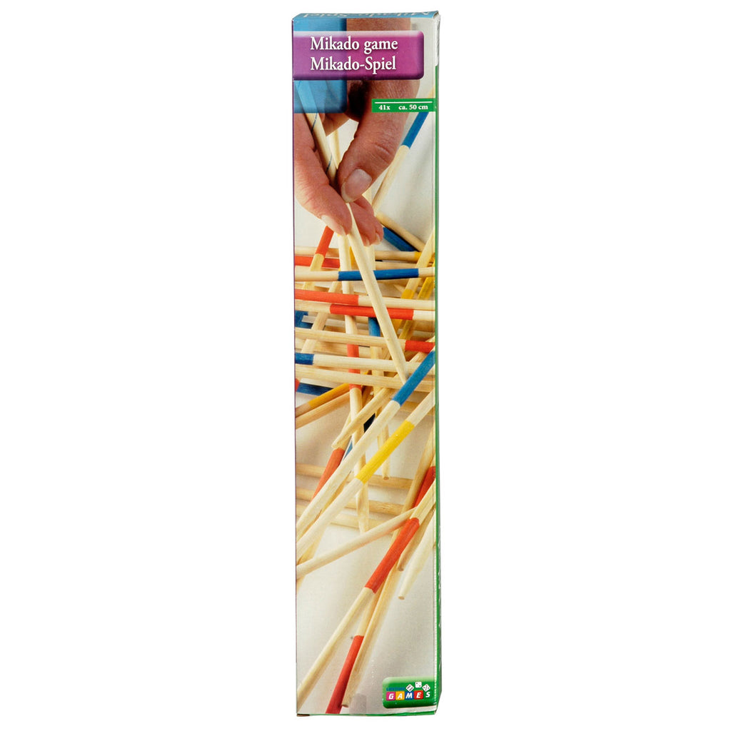Speel het spannende mikado-spel nu in het groot. Laat alle stokjes vallen en probeer een stokje te pakken zonder dat de andere stokjes bewegen. Als dat lukt mag je nog een stokje pakken. De gene met de meeste stokjes (en punten) heeft gewonnen! Deze extra grote Mikado bestaat uit 41 stokjes van ongeveer 50 cm.