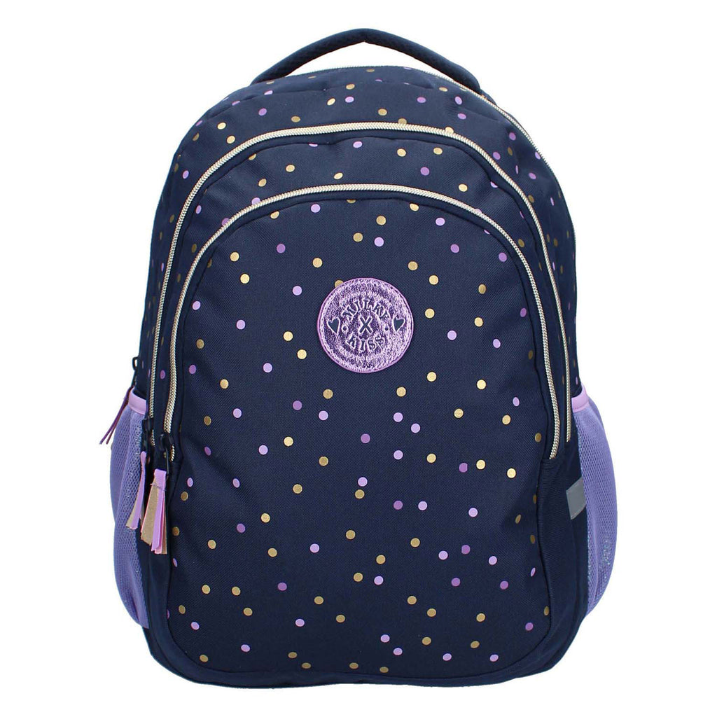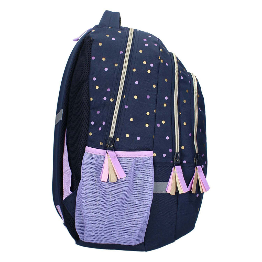 Ontdek de magie van deze rugzak van Milky Kiss uit de Dotted Delight collectie. De tas heeft een donkerblauwe kleur met leuke paars en gouden stippen. Het hoofdvak van de rugzak is ruim en perfect voor het opbergen van alle benodigdheden, terwijl de twee extra voorvakken zorgen voor gemak voor kleinere items. De hoogwaardige ritssluitingen zorgen voor veilige opslag, terwijl de gewatteerde en verstelbare schouderbanden zorgen voor ultiem draagcomfort, zelfs tijdens lange dagen onderweg. Of het nu gaat om een dagje op school of een uitje met vrienden, deze rugzak is de perfecte keuze voor jonge trendsetters die op zoek zijn naar stijl en functionaliteit in één.