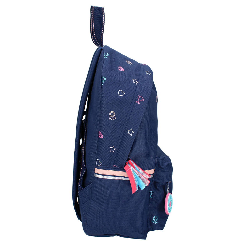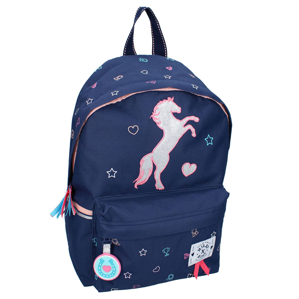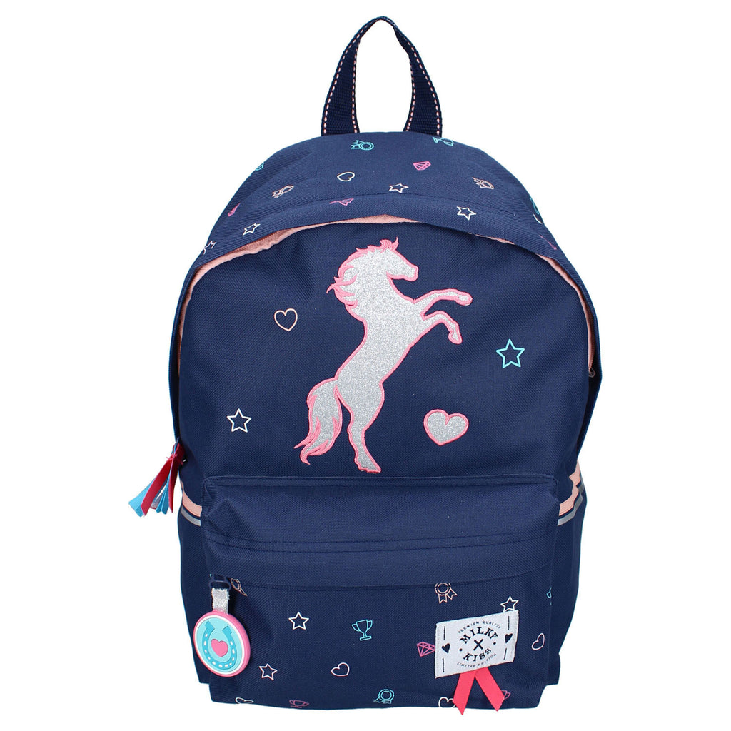 Wie is er nu niet dol op paarden? De Live Love Ride collectie van Milky Kiss is uitgevoerd in navy polyester met Zilveren paardenprint. De rugzak heeft een ruim hoofdvak, afsluitbaar voorvakje, verstevigd rugpand en gewatteerde en in lengte verstelbare schouderbanden. En de schattige print met sterretjes, hartjes en rozetten maakt deze tas helemaal af!