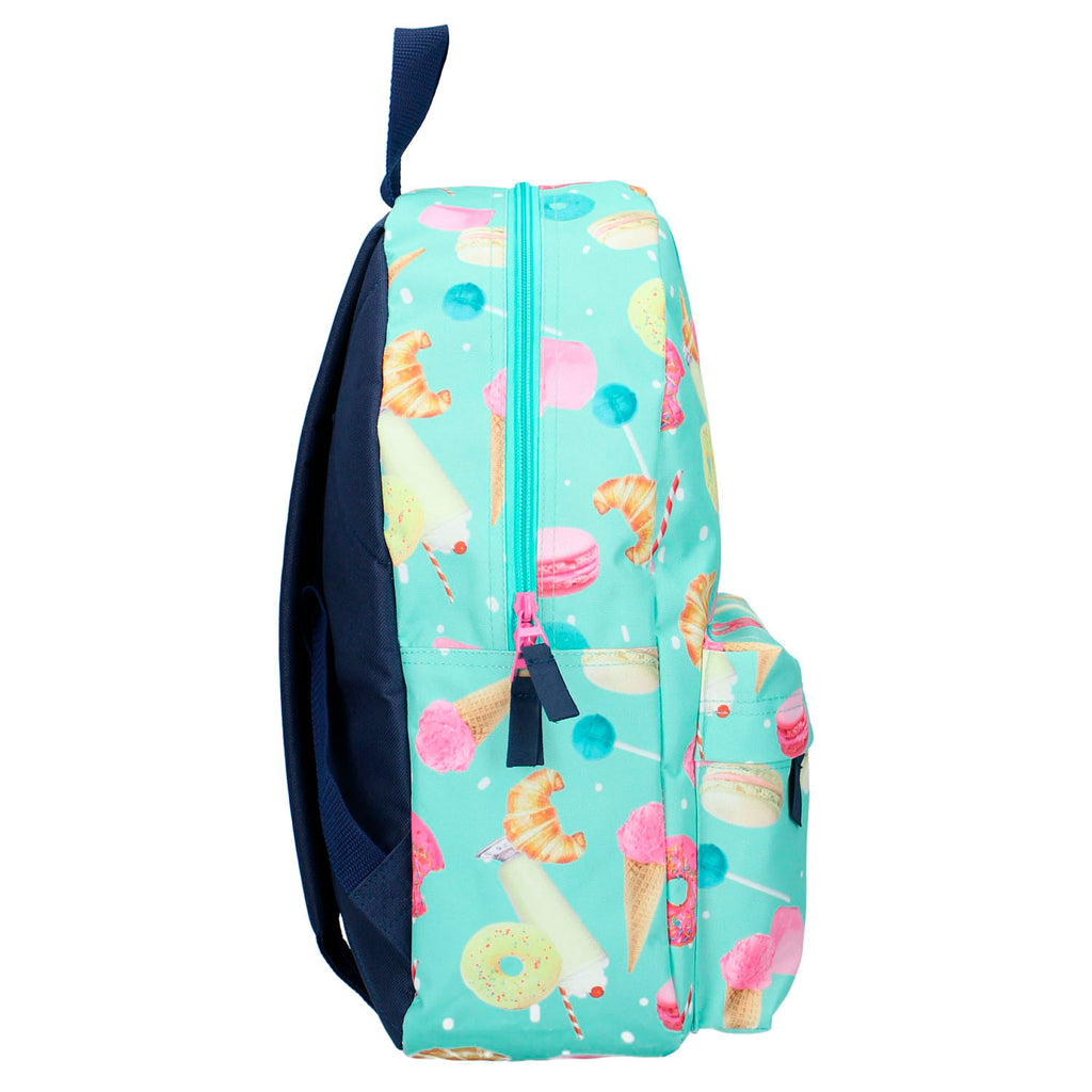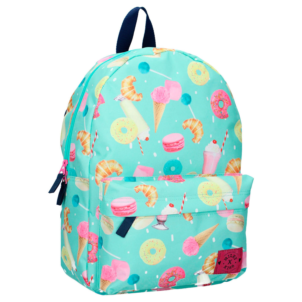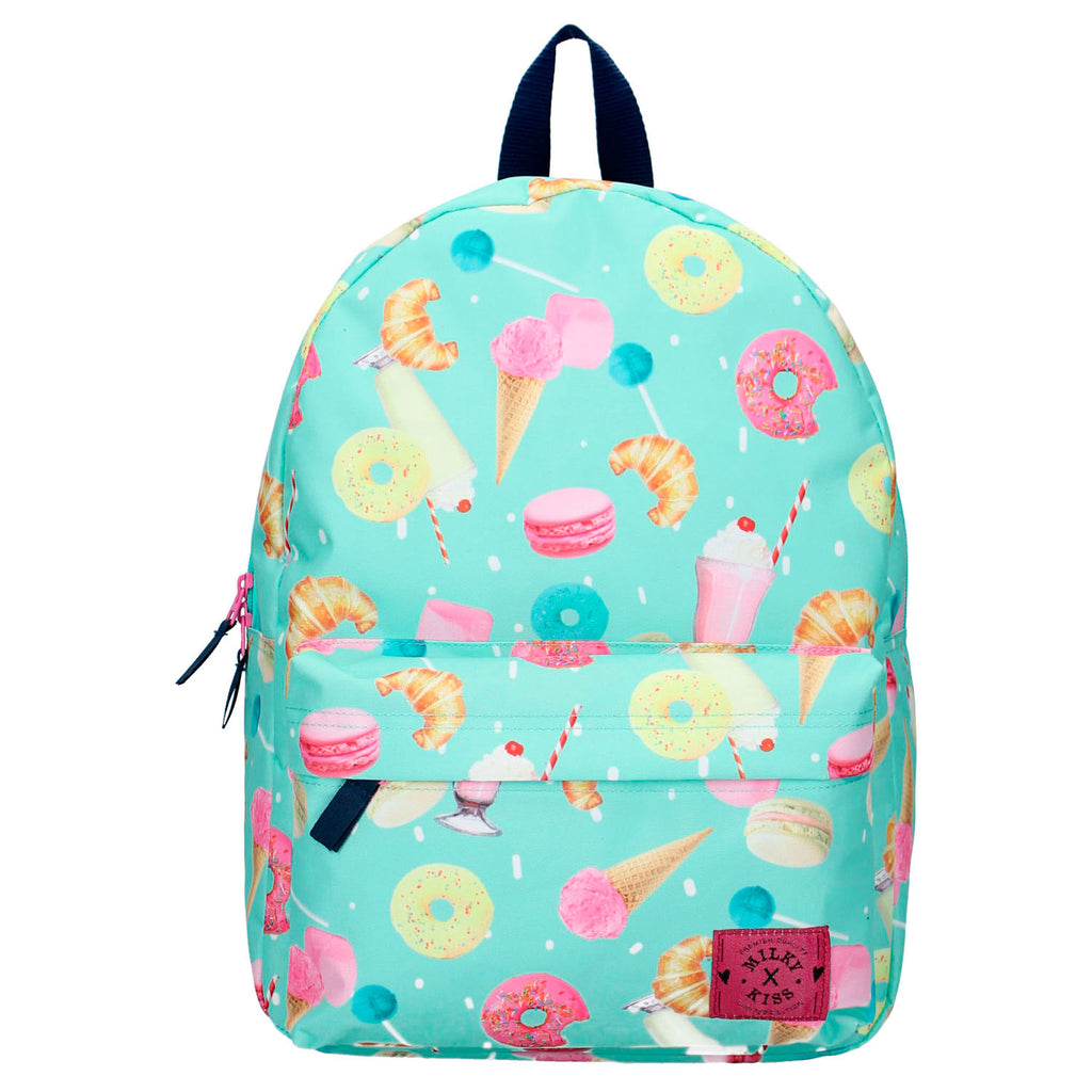 Cuteness overload! Deze Milky Kiss rugzakken zijn super cute & hot en geschikt voor elke fashionista! Met een mintgroene print met heerlijke donuts, croissants en andere lekkernijen, scoort deze rugzak bij al je vrienden. Het formaat van de tas biedt genoeg ruimte voor al je benodigde spulletjes. De tas heeft een ruim hoofdvak en een voorvakje allebei met gouden ritssluiting. Verder kan de rugzak makkelijk opgehangen worden met een ophanglus en heeft comfortabele schouderbanden die versteld kunnen worden.