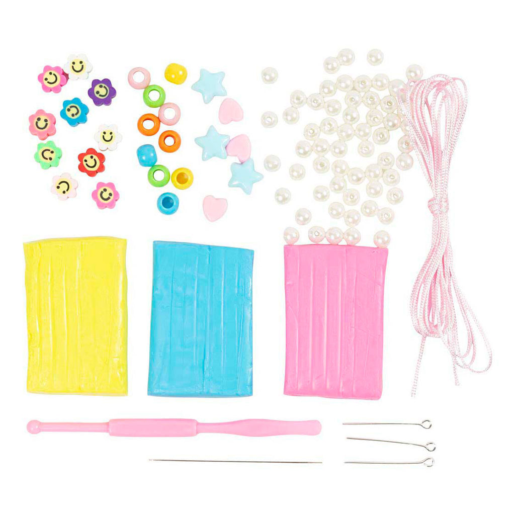 Inhoud: Fijne klei, boetseergereedschap, kettelstift, polyester koord, kralennaald, waskralen, plastic kralen, figuurkralen.
