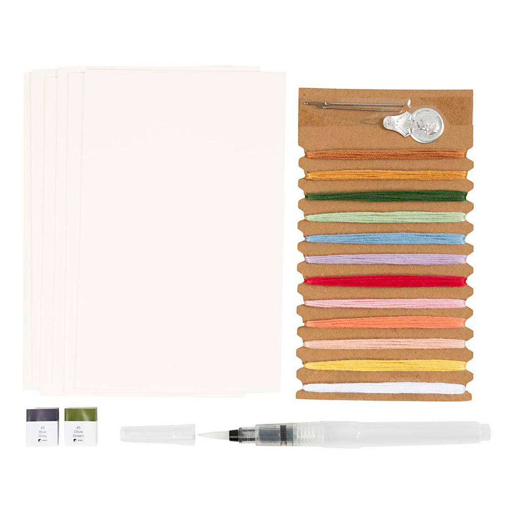 Inhoud: Aquarelpapier, aquarelverf, watertank penseel, borduurgaren, naainaald, inrijghulp.
