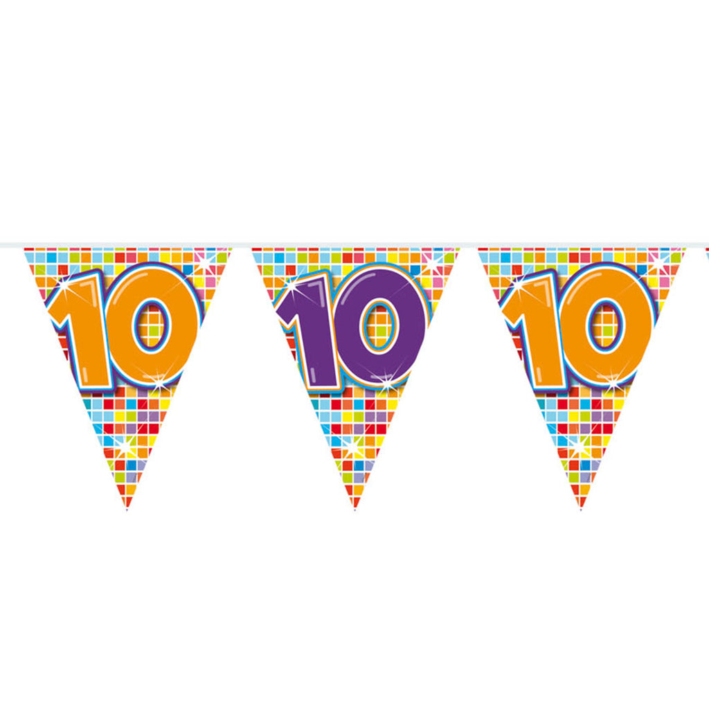 Wordt er iemand 10 jaar? Of vieren jullie een 10-jarig huwelijk of jubileum? Deze kleurrijke slinger staat perfect op ieder soort feestje! De slinger is enkelzijdig bedrukt, heeft 12 vlaggetjes en is 3 meter lang.