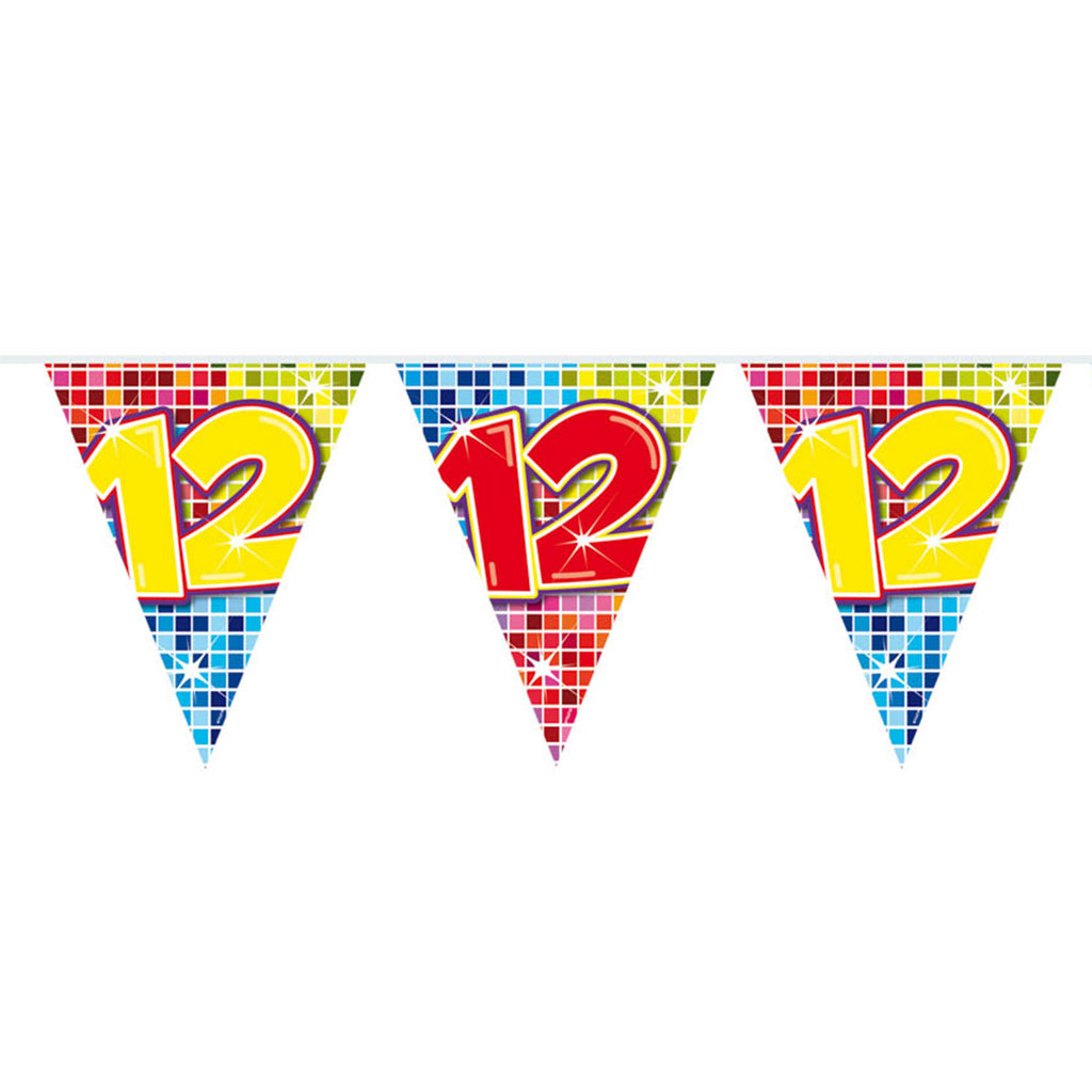 Wordt er iemand 12 jaar? Of vieren jullie een 12-jarig huwelijk of jubileum? Deze kleurrijke slinger staat perfect op ieder soort feestje! De slinger is enkelzijdig bedrukt, heeft 12 vlaggetjes en is 3 meter lang.