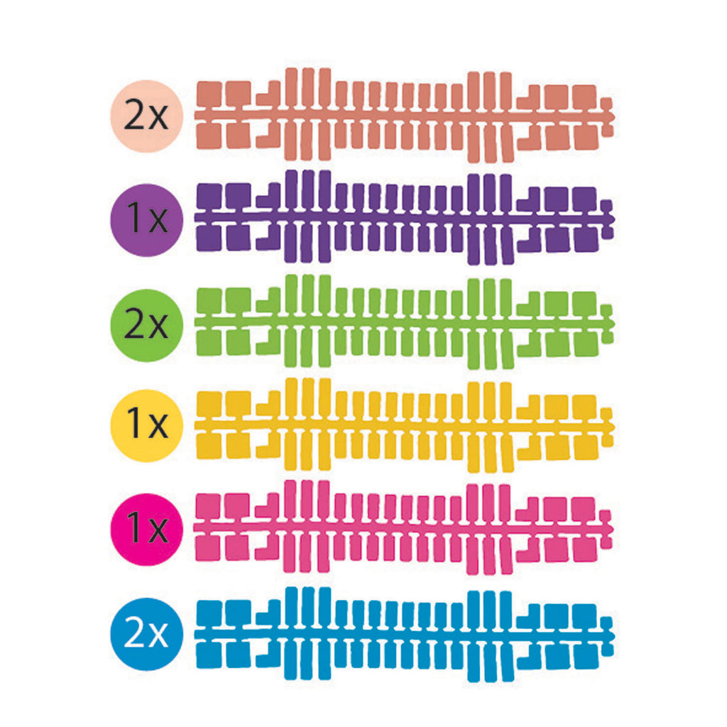 Breid je Ministeck steentjes verzameling uit met deze kleurenstrips in de kleuren perzik (2x), groen (2x), blauw (2x), oranje (1x), roze (1x) en paars (1x). Verpakt per 9 stuks.