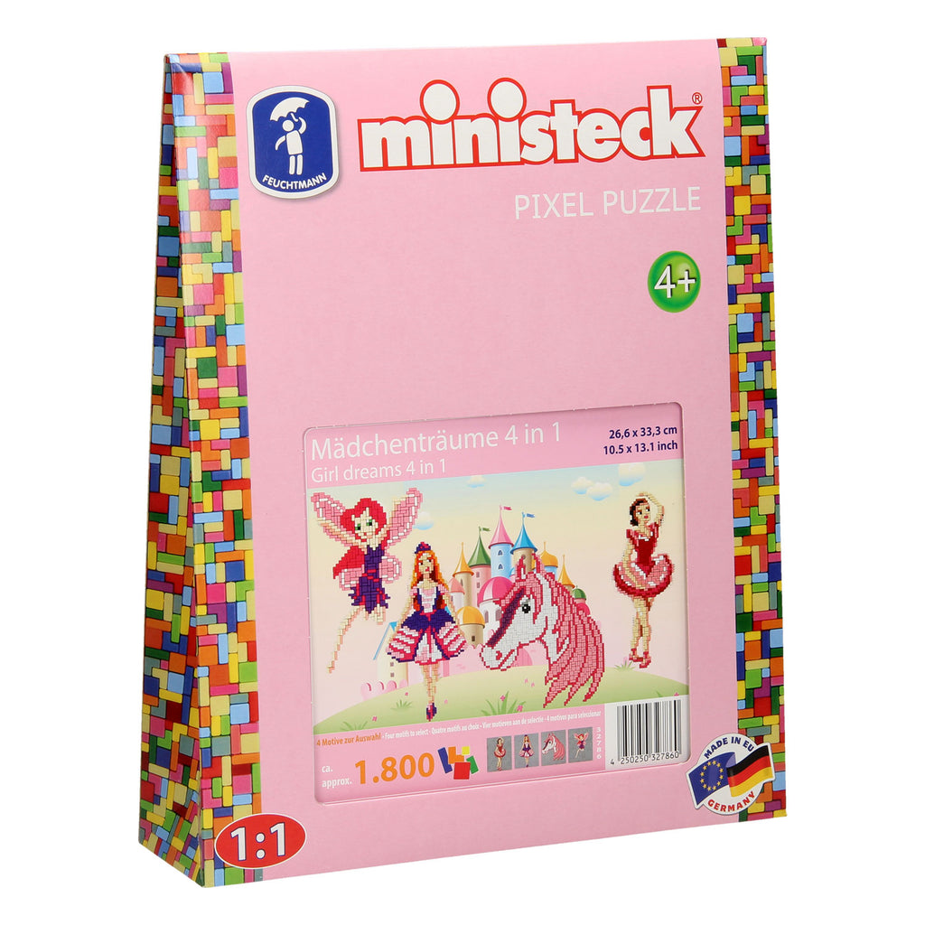 Maak wel 4 verschillende meisjesdromen waar met deze set van Ministeck. Puzzel de gekleurde steentjes op het voorbeeld na en zie een balletdanseres, een fee, een model of een paard verschijnen. De set bevat 1 insteekbord van 26,6 x 33,3 cm, 4 voorbeelden, een ophanghaakje, en demontagetool en ca. 1800 Ministeck steentjes in verschillende kleuren. Spelen met Ministeck stimuleert de ontwikkeling van fijne motoriek, concentratie en creativiteit.