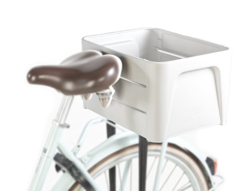 Mirage Klik 'n Krat - Do it yourself, voor een wereld aan bagage  Verkrijgbaar in verschillende kleuren en kleurencombinaties.    Afmeting krat: 41x31x23CM (LxBxH).   Gewicht krat: 1500 gram.    Inhoud krat: 24 liter.    Inhoud doos:   2x zijkant   9x panelen, 3 voorkant - 3 achterkant - 3 bodem   4 standaard tie-wraps en 4 tie-wraps met ronde kop voor montage aan drager     Dagelijks zien we de enorme transporten over de weg, de gigantische magazijnen voor opslag en horen we de verhalen over een circulaire economie. Iedereen die fietst helpt mee aan een gezonder lichaam en een gezondere wereld. Dan doe je zo je best en plaats je een krat op de fiets voor boodschappen of bagage, die juist het enorme transport en opslag (veel lucht) in de hand heeft gewerkt, voordat het bij jou kwam. Daarnaast doen veel kratten, die nu op de markt zijn, niet mee aan een circulaire economie   ze zijn niet van gerecycled materiaal, niet recyclebaar en veelal gemaakt in China. De mensen achter Mirage hebben daar wat op gevonden. Een krat ontworpen en geproduceerd in Nederland, die heel compact is voor transport en opslag, éénmalig door jezelf in elkaar gezet kan worden tot een prachtige blikvanger op je fiets en die gemaakt is van recyclebaar materiaal dat ook weer gerecycled kan worden. Naast het feit, dat we zo de wereld een beetje gezelliger proberen te maken, past er ook nog een wereld aan bagage in. Werelds toch!    Hoe groen wil je het hebben? Maar ze zijn ook in andere kleuren leverbaar.