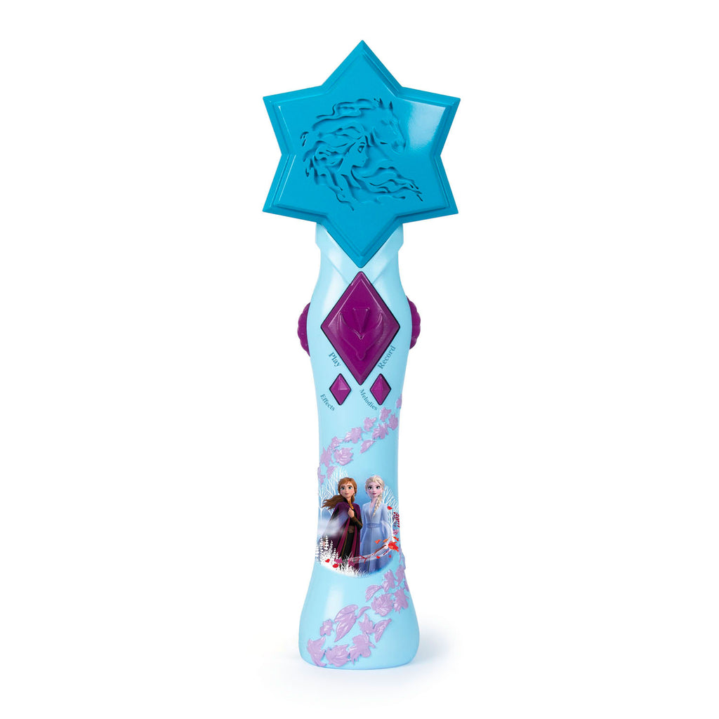 Met deze betoverende microfoon zing je samen met Elsa en Anna de sterren van de hemel. Zing je favoriete liedjes uit de film Frozen en dankzij de opnamefunctie kun je je eigen show steeds opnieuw beluisteren. Voor een echt betoverend effect heeft de microfoon ook sneeuwvlokjes die oplichten als je aan het zingen bent! De microfoon is bedrukt met afbeeldingen van Anna en Elsa en is voorzien van verschillende melodietjes en effecten. De microfoon werkt op 3 AAA batterijen (niet inbegrepen).