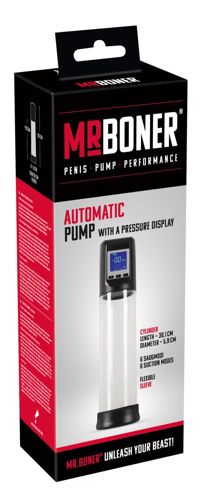 Fully automatic penis pump Automatic Pump by Mr. Boner with 6 suction modes. A display with the time and pressure in kPa offers perfect control. In addition, the individual suction modes are displayed in a cheeky penis scale from small to large. The cylinder has an easy-grip diamond design and a removable sleeve for easy cleaning. Rechargeable with included USB cable.