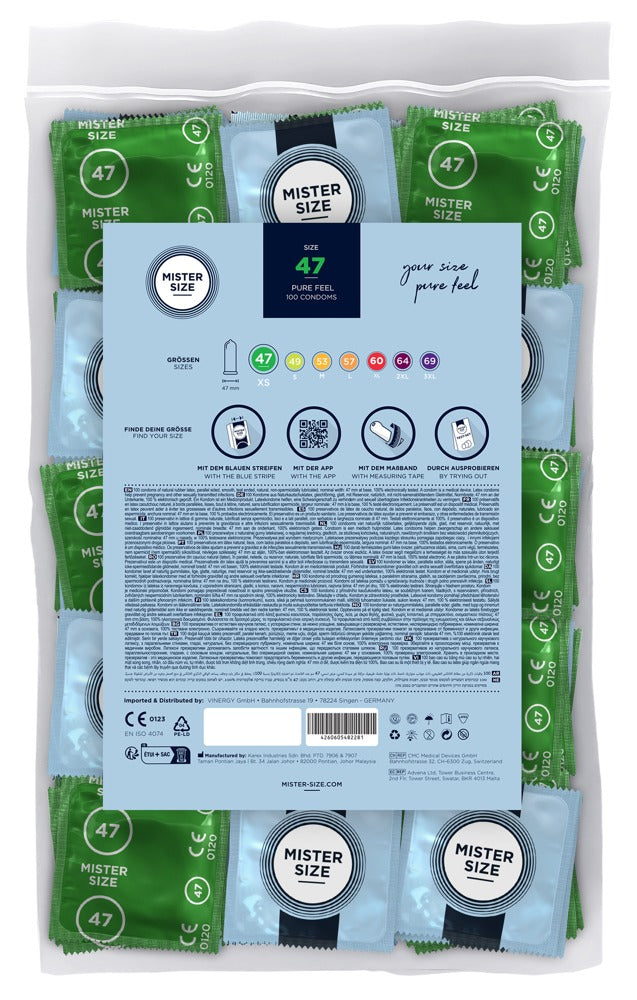 Op de voorkant van de verpakking kan de breedte van de donkerblauwe middenstreep gebruikt worden om de juiste condoommaat voor de penis in te schatten. Maat 47 mm is geschikt voor een penisomtrek van 9,5 tot 10 cm.