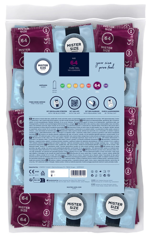 Op de voorkant van de verpakking kan de breedte van de donkerblauwe middenstreep gebruikt worden om de juiste condoommaat voor de penis in te schatten. Maat 64 mm is geschikt voor een penisomtrek van 14,5 tot 15,5 cm.