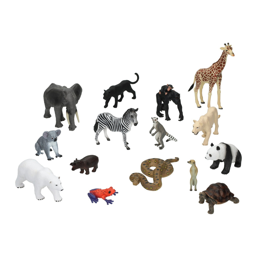 Inhoud van het pakket: olifant, giraffe, zebra, panda, ijsbeer, koala, panter, chimpansee met jong, witte leeuw, ringstaartmaki, meerkat, slang, schildpad, rode gifkikker en nijlpaard.