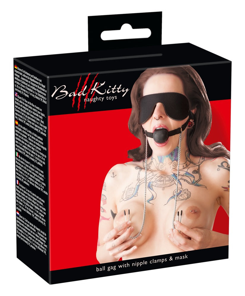 Oogmasker met geïntegreerde mondknevel aan een elastisch bandje en verstelbare tepelklemmen aan kettinkjes. De diameter van de gag bal is ongeveer 4 cm en de lengte van de ketting is ongeveer 30 cm. Lengte per klem: 7 cm.