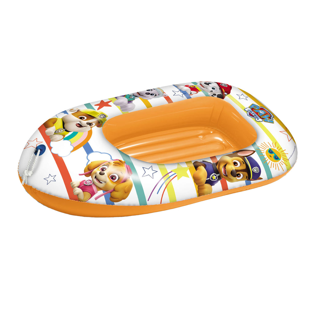 Wit met oranje gekleurde opblaasboot met Marshall, Everest, Rubble, Skye en Chase van PAW Patrol erop afgebeeld. Afmeting: 112 cm.