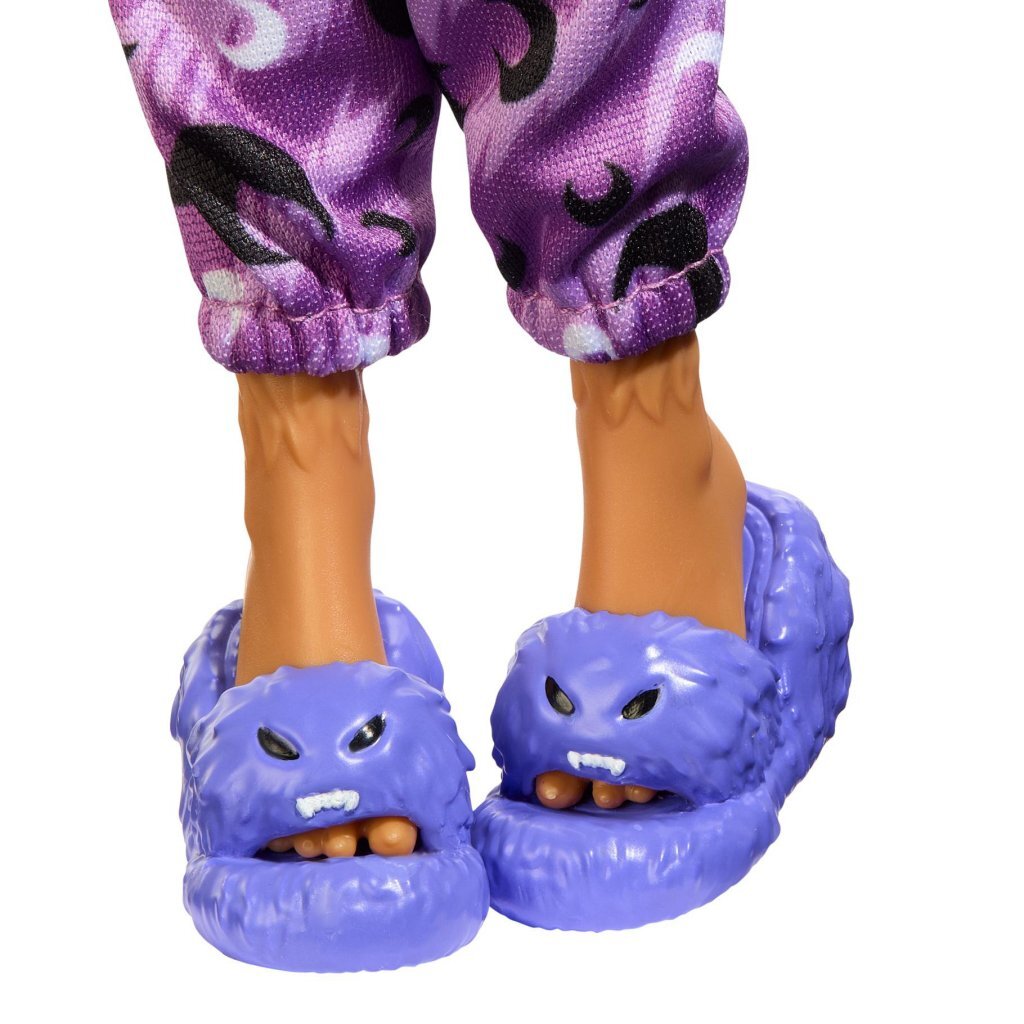 Monster High introduceert Creepover Party, een verzameling griezelige personages met thema-accessoires die inspireren tot het vertellen van verhalen en freaky-fab modespel. Het pluizige vest van Clawdeen Wolf-pop is knus op de meest schattige manier mogelijk! Ze draagt het over een "Creep All Day" cropped T-shirt en joggers met maanprint. Deze weerwolf is absoluut bloeddorstig met haar volumineuze krullen die in een half opgestoken kapsel zijn getrokken. Ze maakt haar look compleet met een harig oogmasker en pantoffels. Over comfort gesproken! Alle griezelbenodigdheden zijn inbegrepen: een zacht kussen, kom-boo-cha-drankje en monsterpizza met een geïllustreerde, doodskistvormige bezorgdoos. Pop is ongeveer 25 cm lang, is volledig beweegbaar en kan niet alleen staan. Geschikt voor kinderen vanaf 4 jaar.