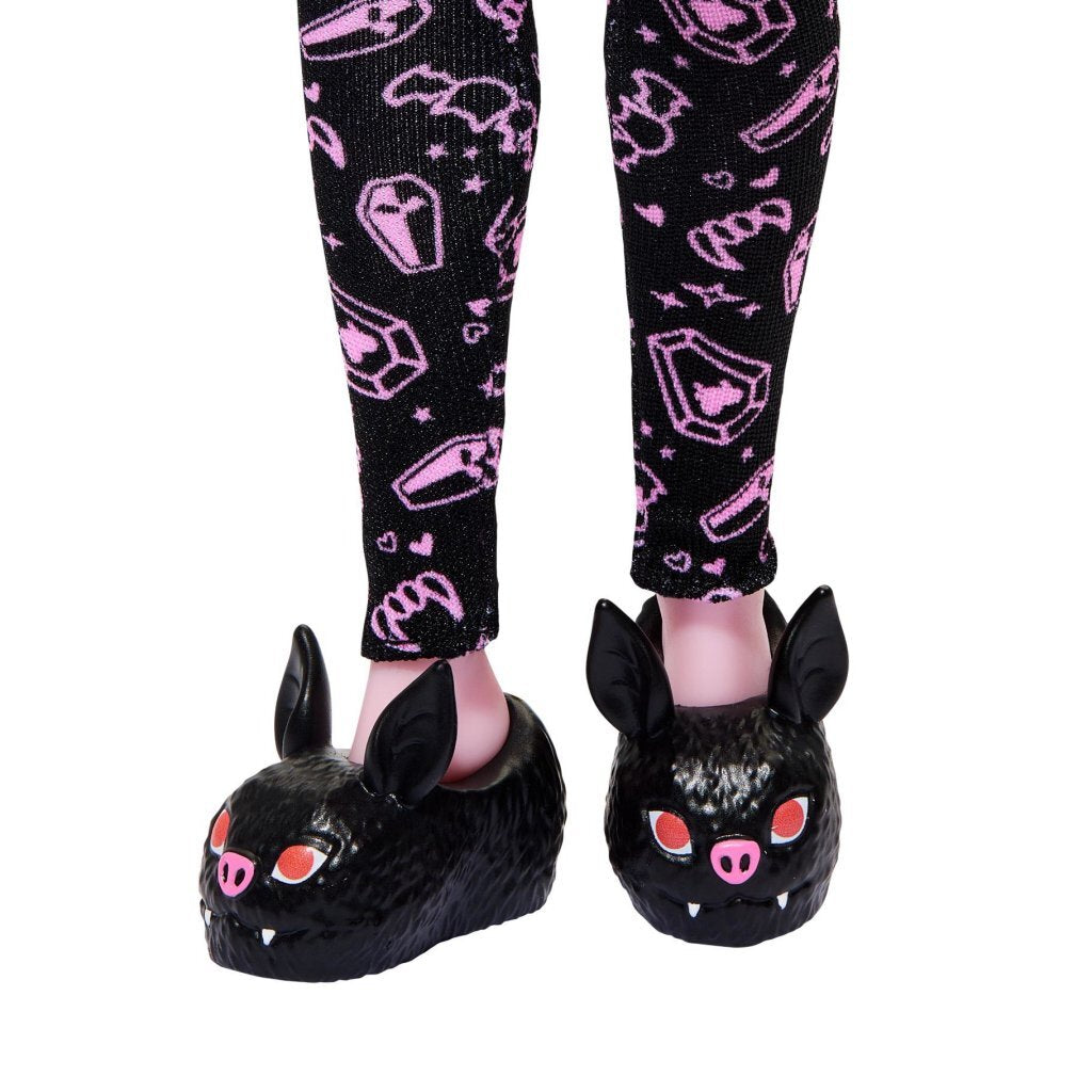 - Deze vampier is bitter stijlvol met haar ruimtebroodjes en niet bij elkaar passende grove oorbellen! Ze completeert haar look met een roze hoofdband met vleermuisoortjes en griezelige vleermuisslippers