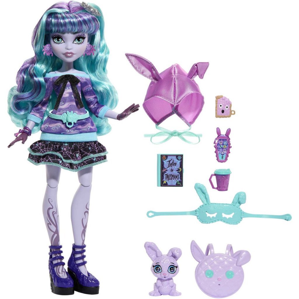 Monster High introduceert Creepover Party, een verzameling griezelige personages met thema-accessoires die inspireren tot het vertellen van verhalen en freaky-fab modespel. Twyla's swirly gebreide trui is monsterlijk knus! Ze combineert het met een volantrok met spinnenwebdetails, hakken met bandjes en een satijnen hoodie met konijnenoren. Dit schaduwmonster loert op de loer met golvend ombre haar en gekrulde pony. Ze zou er niet aan denken om naar een slaapfeestje te gaan zonder Dustin, haar stofkonijntje of bijpassende rugzak van het stofkonijntje!