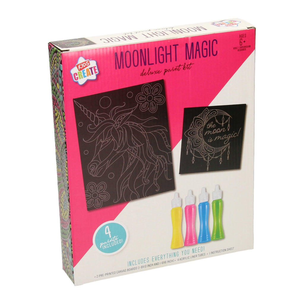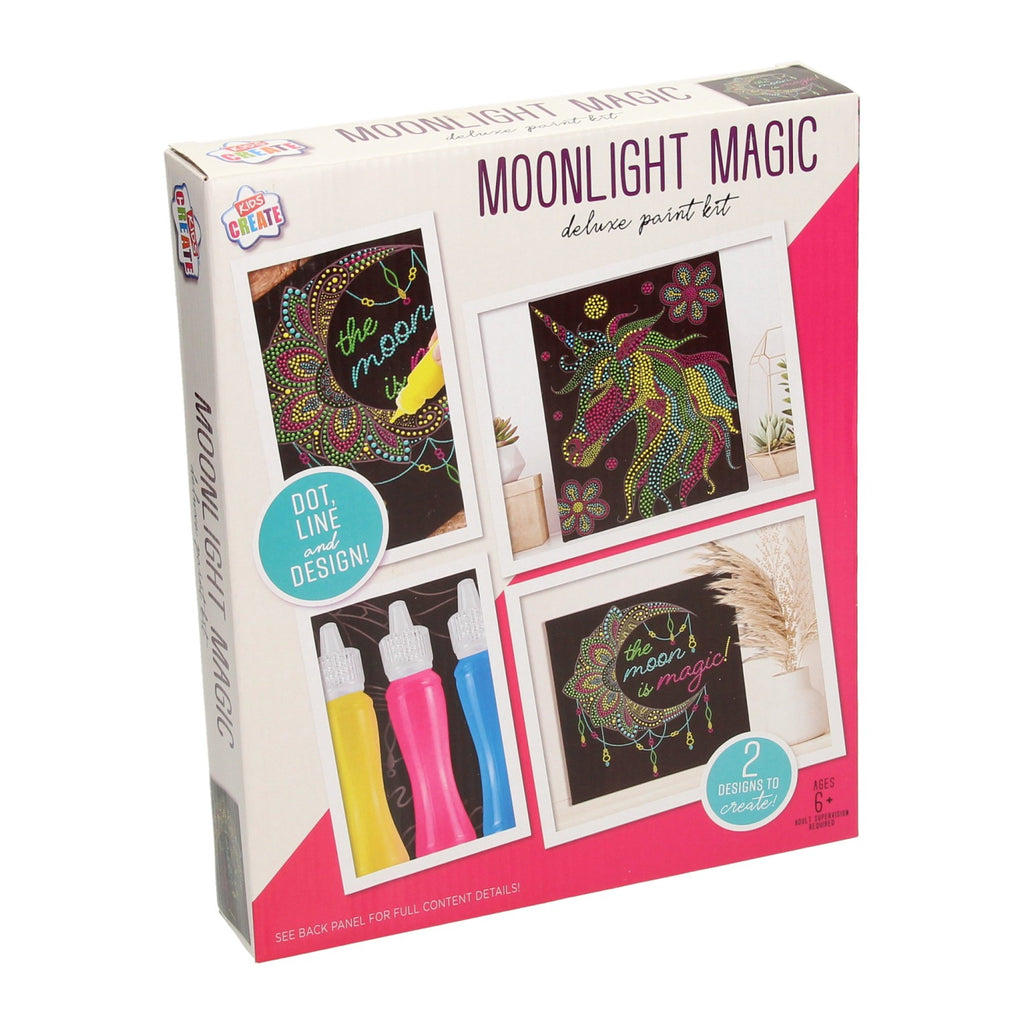 Magisch maanlicht deluxe verfkit, met 2 zwarte platen weer je 2 designs (een maan en een eenhoorn) op kunt maken met de gekleurde verf. Geschikt voor kinderen vanaf 6 jaar oud.