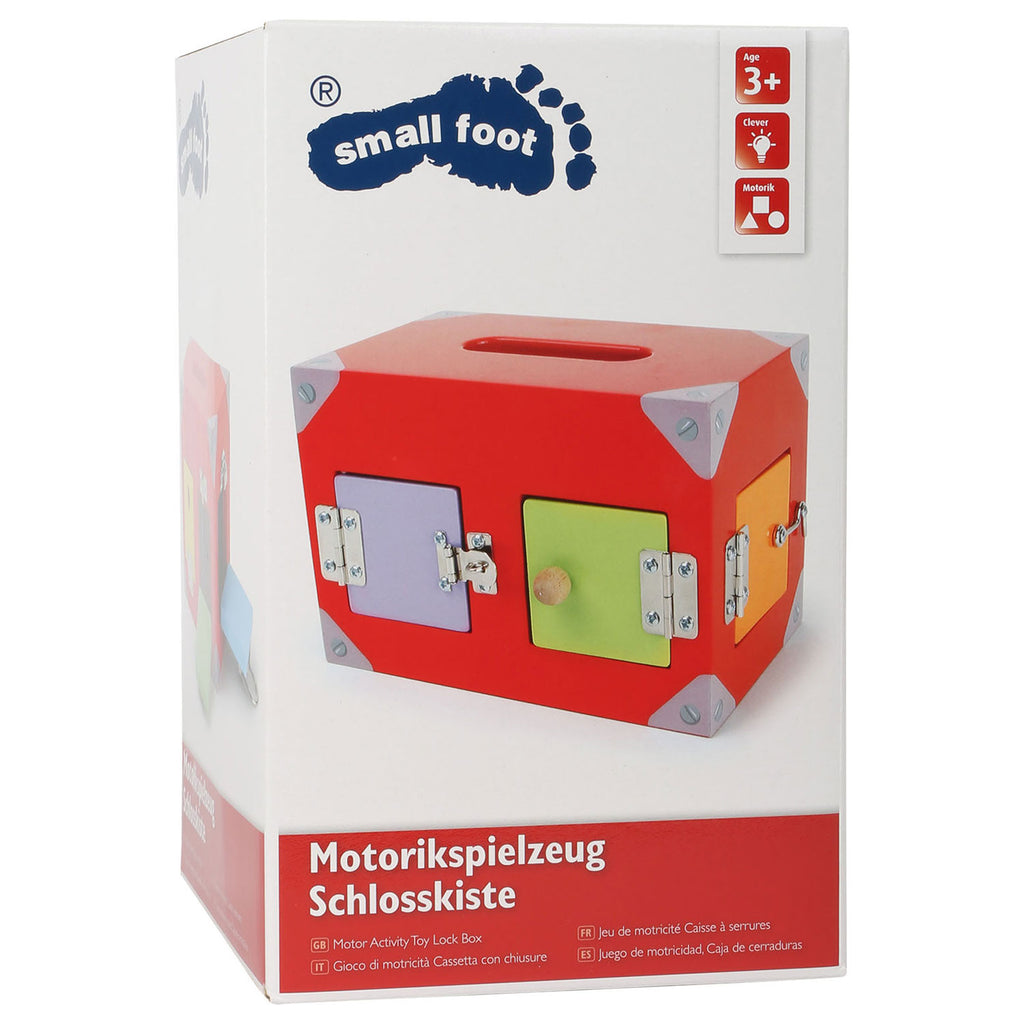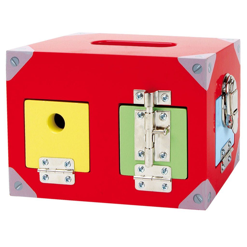 Deze houten slotenkist bevat kleurrijke ramen en deure die allemaal hun eigen slot hebben. Wie slaagt erin om ze allemaal te openen? Deze lastige uitdaging stimuleert de ontwikkeling van motoriek, coördinatie en behendigheid. Geschikt voor kinderen vanaf 3 jaar.
