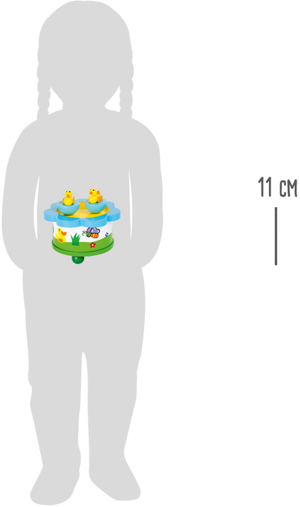 Kwak kwak! Deze twee kleine eendjes zullen de ogen van kinderen laten stralen van vreugde als ze over hun vijver dansen op een lieflijk deuntje. De kleine eendjes blijven door middel van magneten veilig bovenop dit houten muziekdoosje. Deze muziekdoos met kindvriendelijk design maakt indruk met zijn liefdevolle details en helpt kinderen op weg naar dromenland. Dankzij de eenvoudige bediening kunnen zelfs kinderen deze muziekdoos zelfstandig bedienen.