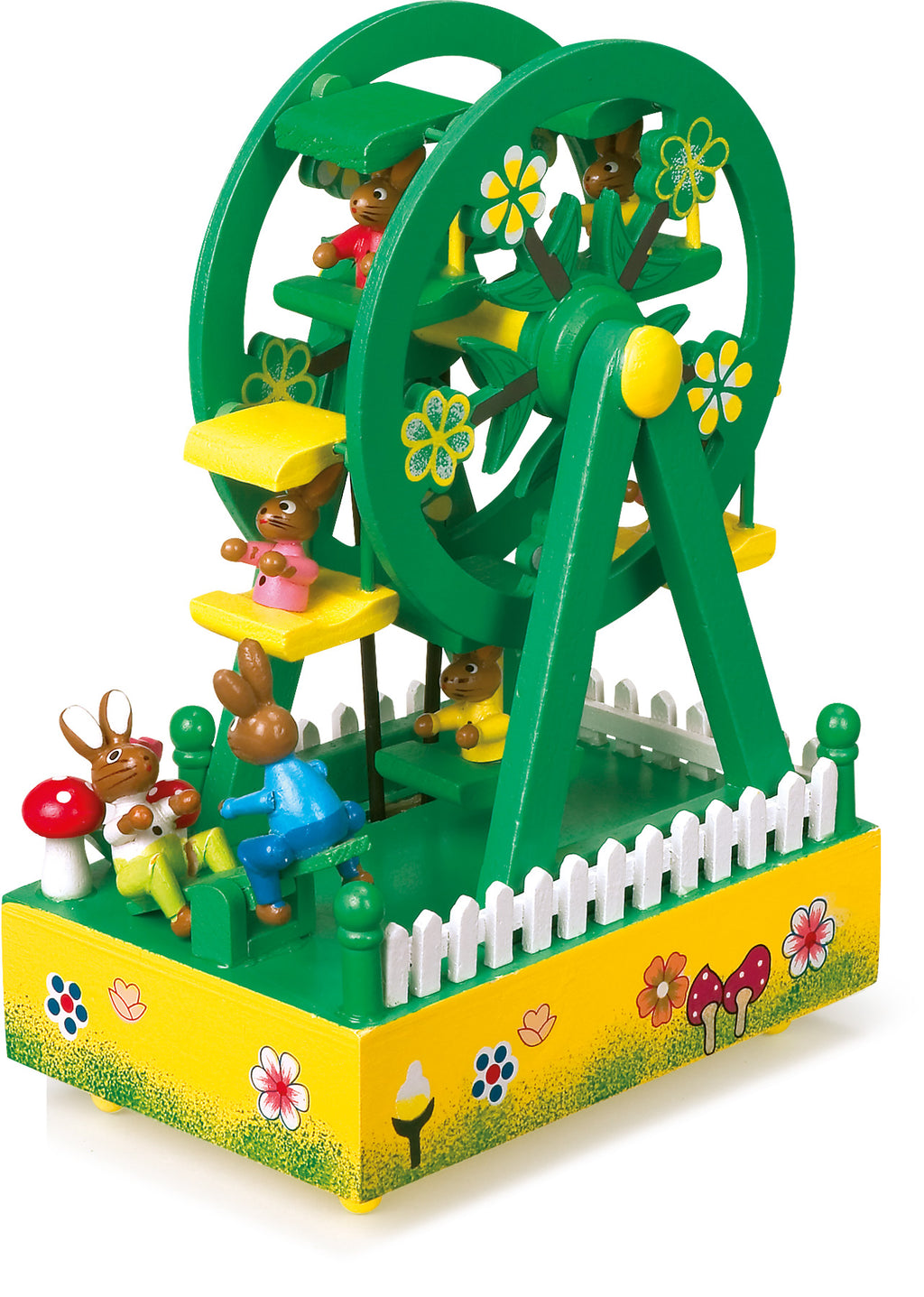 Een leuk ritje in een reuzenrad! Dit mooie muziekdoosje van hout is een echte blikvanger op het nachtkastje. Hier dansen de schattige haasjes rond op de melodie van "Over the Rainbow" en kunnen er maar geen genoeg van krijgen. Onder begeleiding van de volgzame tonen valt elk kind zachtjes in slaap en in dromenland. Dit rijk gedetailleerde speeldoosje is ook een geweldig decoratief verzamelobject.