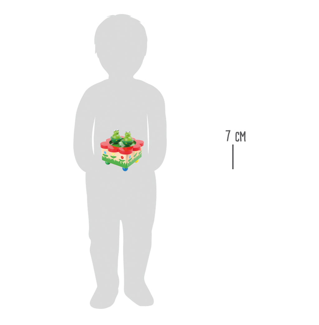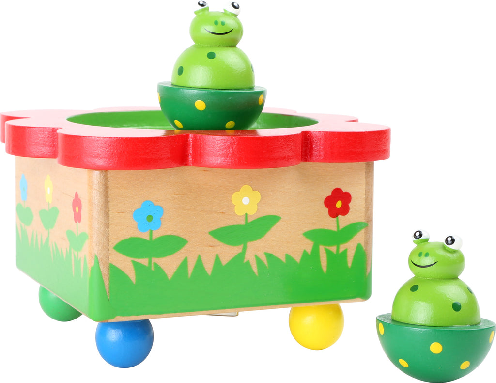 Dansen bovenop de kikkerpoel! Deze vrolijk gekleurde houten muziekdoos speelt de melodie "Merrily We Roll Along" terwijl de twee magnetische kikkers erop dansen. De kikkers zijn uitneembaar en dankzij de eenvoudige bediening van de speeldoos ook zelfstandig te gebruiken door kinderen. De schattige details zorgen samen met de mooie muziek voor ontspanning en begeleiden kinderen op hun reis naar de wereld van dromen.