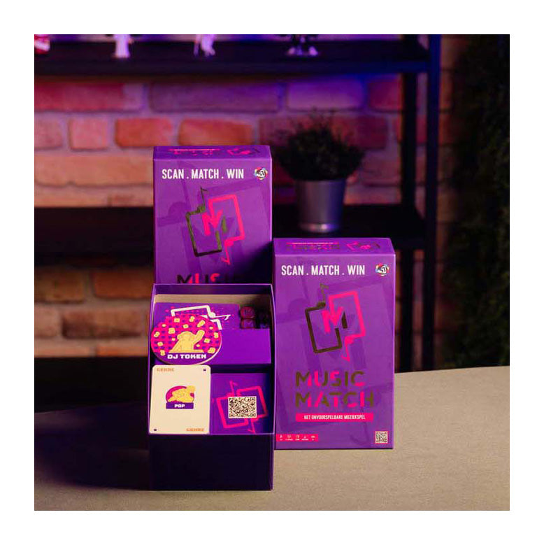 Music Match is een muzikaal kaartspel waarbij je als eerste al je kaarten probeert weg te spelen. Scan een QR-Kaart en match een kaart uit je hand met de muziek, bijvoorbeeld op artiest, genre of decennium. Draai de kaarten om en ontdek wie er goed zat!