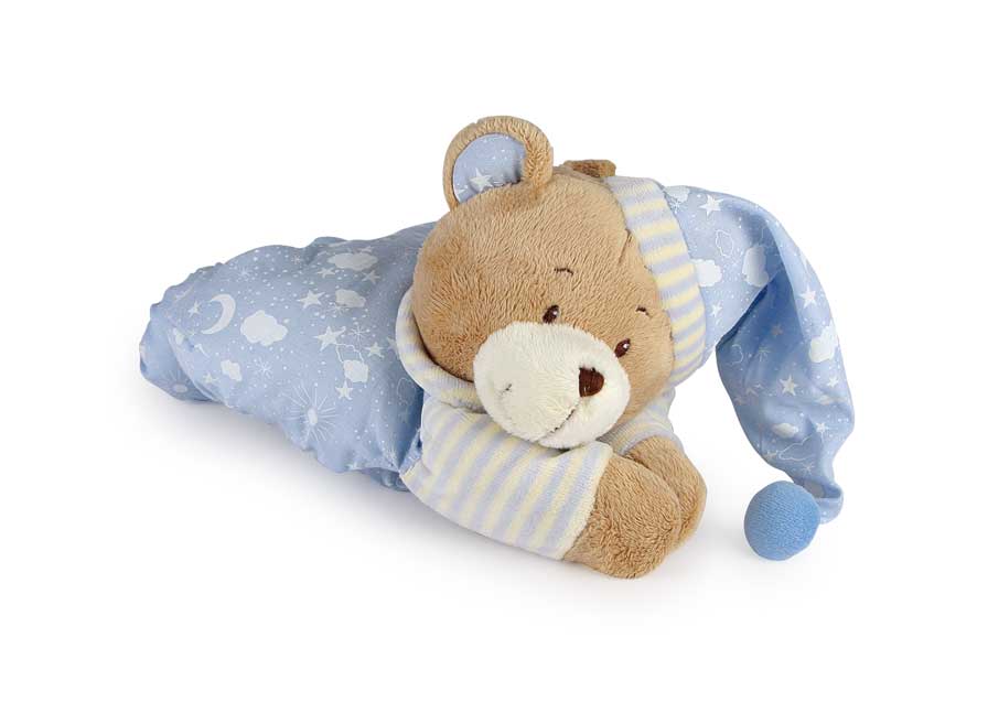De zachte beer in zijn blauwe pyjama zorgt voor zoete dromen! Hij speelt het bekende slaapliedje "Good evening, good night"! Om op te hangen zijn 2 zachte linten genaaid.