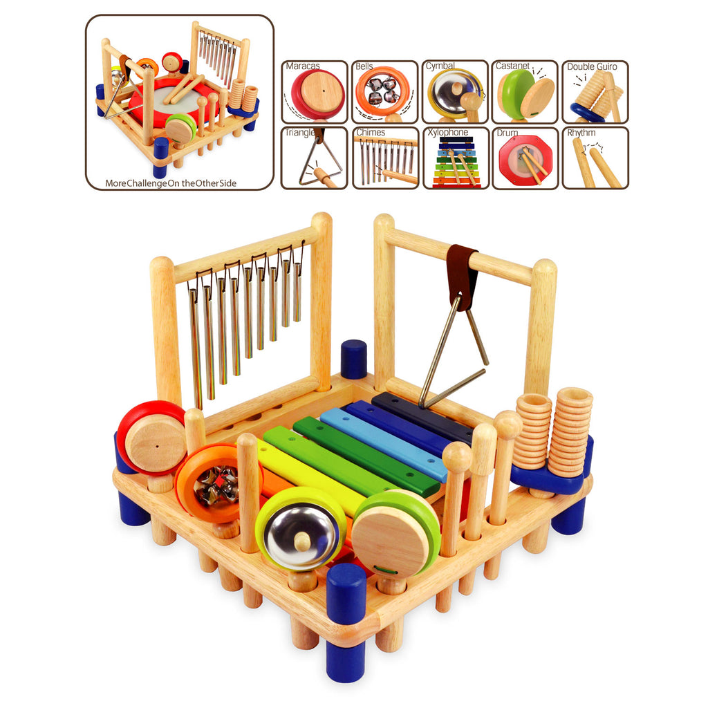 Ga lekker muziek maken met dit muziek centrum. Aan elke kant van het blok vindt je weer meer uitdaging en andere instrumenten. Deze set prikkelt je nieuwsgierigheid en het helpt je met je gevoel voor ritme en geluid. Je leert wel omgaan met 10 verschillende instrumenten: Maracas, bellen rammelaar, cimbaal, castagnetten, dubbele guiro, triangel, klokkenspel, xylofoon, trommel, en ritme stokken. Zo heb je uren muziek- en speelplezier!