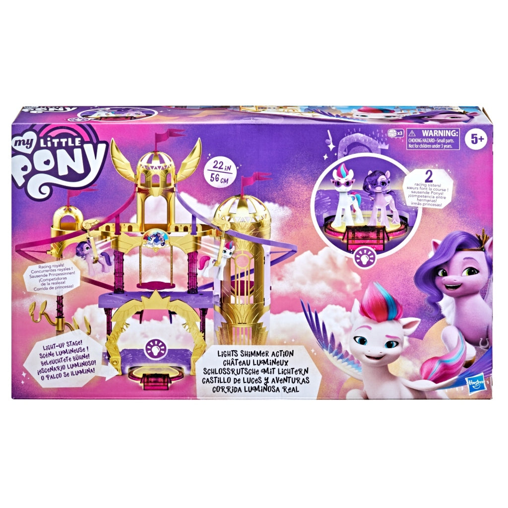 Maak kennis met de Pegasus-prinsessen van Zephyr Heights: Princess Petals en Zipp Storm.Deze zusjes zijn royaal uniek!Stel je voor dat ze aankomen voor een show in stijl met deze speelset.Geïnspireerd door het Zephyr Heights-paleis in de film My Little Pony: A New Generation.Bevestig de meegeleverde Princess Petals- en Zipp Storm-figuren aan de kabelbanen.Stuur ze dan van de hoogste toren in het kasteel naar het podium.Het podium licht op voor nog meer magie!Inclusief 3 modeaccessoires en leuke, actieve speelplekken in het kasteel.Een geweldig cadeau voor kinderen van 5 jaar.