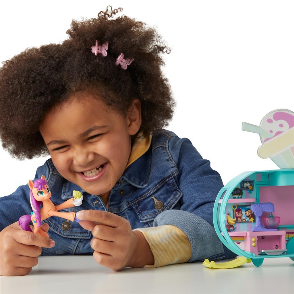 Sunny Starscout is een avontuurlijke aardpony die zoete lekkernijen maakt in haar mobiele smoothietruck in de serie My Little Pony: Make Your Mark. Deze My Little Pony-set bevat een beweegbare ponyfiguur van 7,5 cm die kinderen op verschillende manieren kunnen opstellen. Deze foodtruckspeelset voor kinderen gaat open en wordt een keuken met namaaketen om mee te spelen! Stel je voor dat je namaakcupcakes maakt in de oven of namaaksmoothies met het blenderaccessoire. Druk de hoef van het Sunny Starscout-speelgoed op de hendel van de truck om de neonreclame aan te steken en het raam te openen. Open vervolgens de truck om de speelkeuken aan de binnenkant te ontdekken. De set bevat 15 accessoires waarvan je sommige kunt vastmaken aan Sunny's hoef. De foodtruck, speelsets voor kinderen en kleine poppen van My Little Pony zijn ideaal als verjaardagsgeschenk voor meisjes en jongens vanaf 5 jaar.