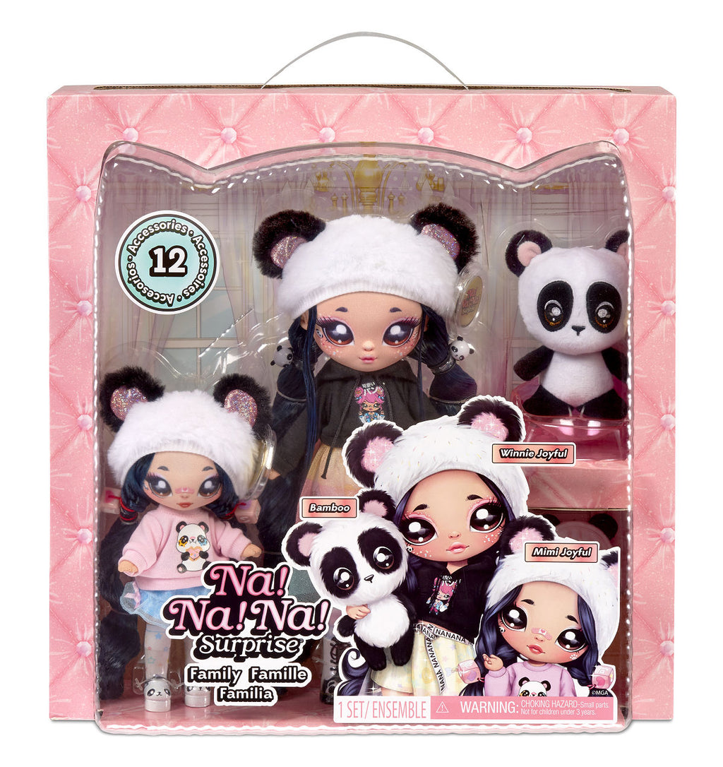 Verzamel de hele Na! Na! Na! Panda-familie, geïnspireerd op een panda! Bevat de zachte Teens-modepop Winnie Joyful van 28 cm, haar zusje Mimi Joyful van 19 cm en nu voor het eerst hun pluchen panda Bamboo van 11,5 cm. Ze zijn allemaal beweegbaar en poseerbaar. De poppen hebben prachtig, extra lang haar en speelse, geprinte make-up. Hun street fashion is voorzien van schitterende details.