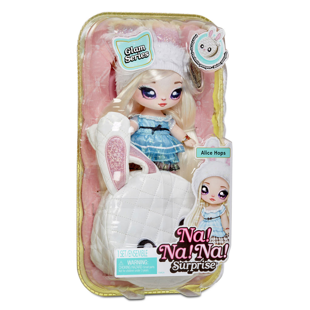 Geef je leven nog meer glamour met de Na! Na! Na! Surprise 2-in-1 zachte modepop uit de Glam-serie! Je krijgt 2-in-1 met een zachte modepop én een verzamelbaar pompontasje van metallic stof met dierenthema en clip! De Glam-serie glinstert als nooit tevoren door de adembenemende poppenmode met dierenthema en een tasje van metallic stof met een handige en schattige clip in de vorm van een dier om het aan je rugzak of aan een grotere tas te hangen. Na! Na! Na! Surprise-poppen zijn de allereerste zachte, poseerbare modepoppen met geprint gezichtje en modedetails. Nu verpakt in een doos met raampje, zodat je alle hoogwaardige details kunt zien en het nog makkelijk is om ze te verzamelen! Alice Hops is inclusief label met haar naam, verjaardagsdatum en een verhaaltje over haar erop. De Glam-serie omvat 6 supermooie, zachte modepoppen en pompontasjes van metallic stof om te verzamelen.
