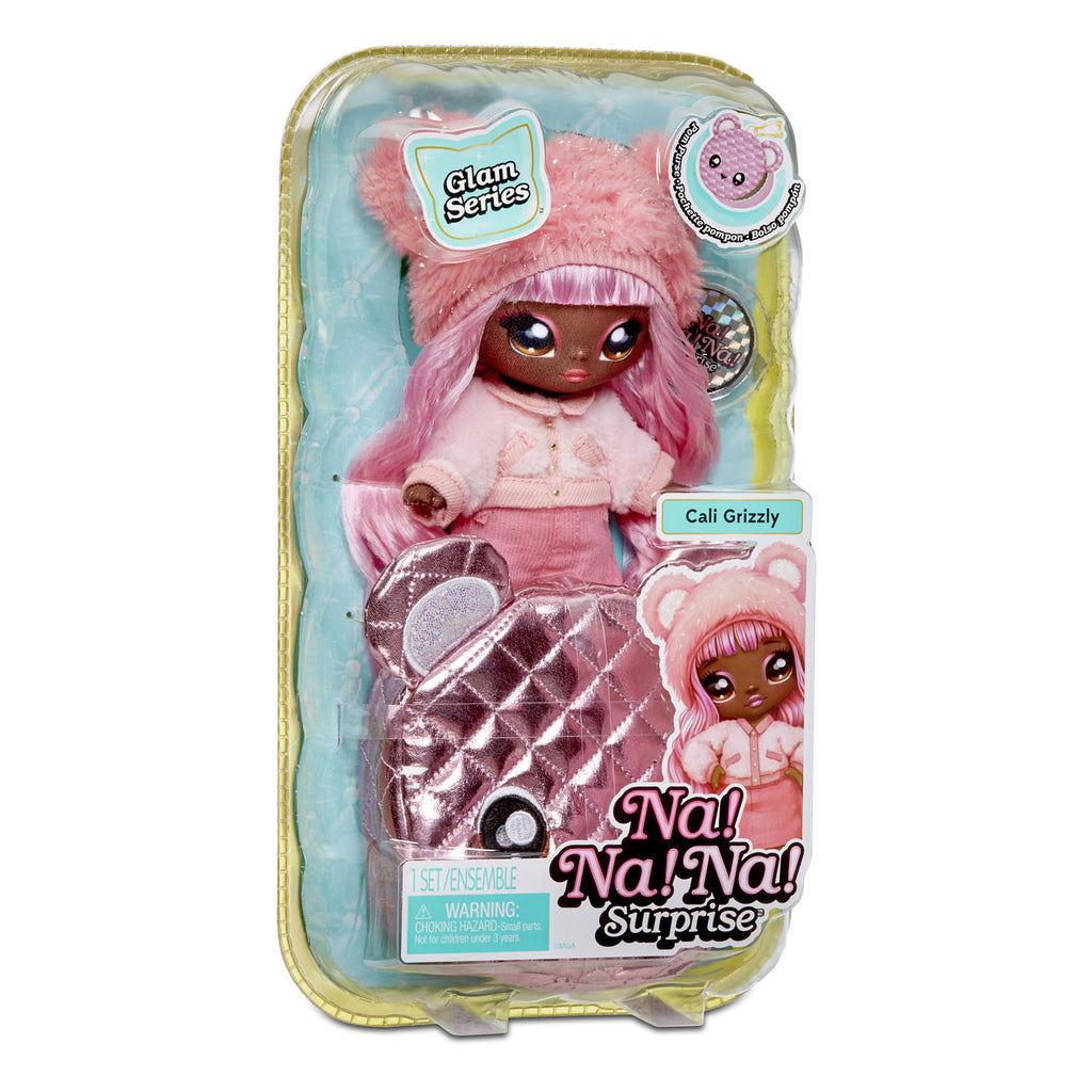 Geef je leven nog meer glamour met de Na! Na! Na! Surprise 2-in-1 zachte modepop uit de Glam-serie! Je krijgt 2-in-1 met een zachte modepop én een verzamelbaar pompontasje van metallic stof met dierenthema en clip! De Glam-serie glinstert als nooit tevoren door de adembenemende poppenmode met dierenthema en een tasje van metallic stof met een handige en schattige clip in de vorm van een dier om het aan je rugzak of aan een grotere tas te hangen. Na! Na! Na! Surprise-poppen zijn de allereerste zachte, poseerbare modepoppen met geprint gezichtje en modedetails. Nu verpakt in een doos met raampje, zodat je alle hoogwaardige details kunt zien en het nog makkelijk is om ze te verzamelen! Cali Grizzly is inclusief label met zijn naam, verjaardagsdatum en een verhaaltje over hem erop. De Glam-serie omvat 6 supermooie, zachte modepoppen en pompontasjes van metallic stof om te verzamelen.